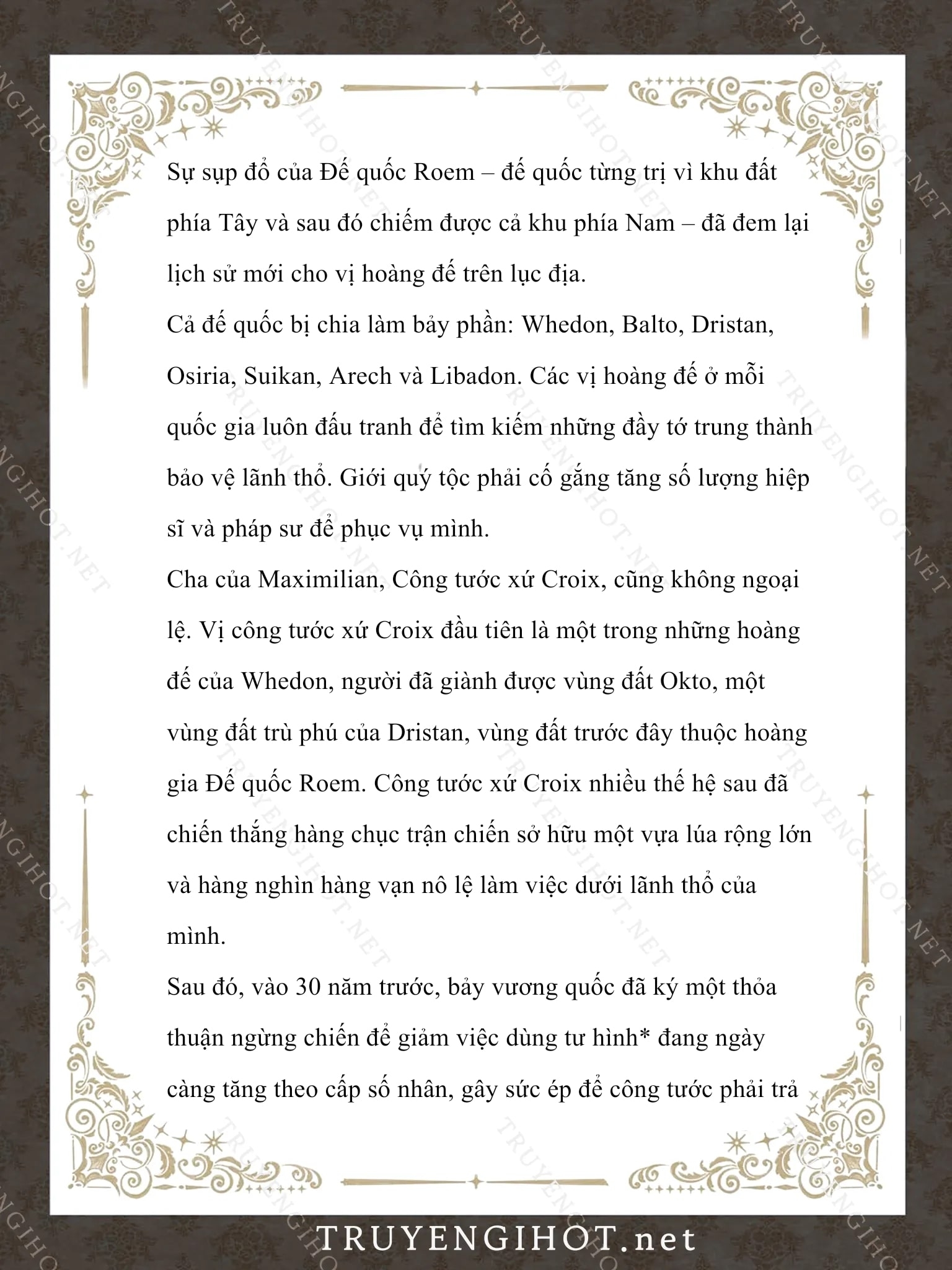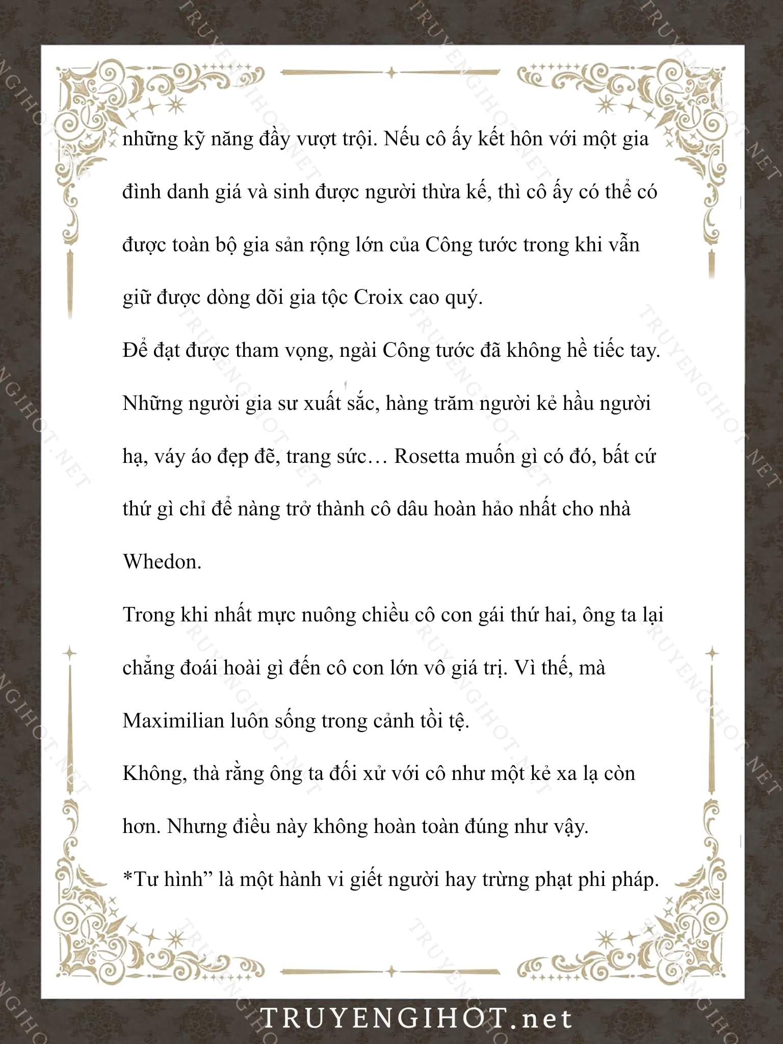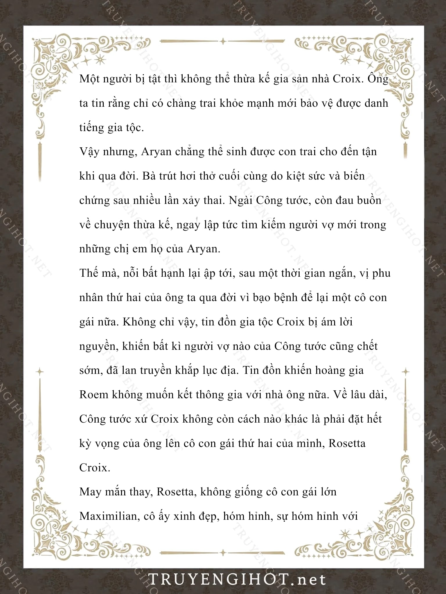 Maximilian Calypse lo lắng đi đi lại lại trong phòng tranh. Nàng căng thẳng đến mức vô thức cắn móng tay, rồi công tước xứ Cross đột nhiên bước vào. Nghe thấy tiếng gậy của ông đập trên sàn nhà, Max đã vội giấu tay ra sau lưng. “Tao đã cảnh cáo mày bao nhiêu lần về cái thói quen cắn móng tay tởm lợm đó rồi hả?!” “Con, con xin lỗi…” Max cúi đầu thấp đầu trước giọng nói lạnh lùng của cha mình. Ngài công tước tậc lưỡi, đảo mắt một vòng quanh phòng. “Đừng có làm xấu mặt tao. Mày may mắn lắm mới có được những thứ này đấy. Tao sẽ không tha thứ cho cái thói quen bẩn thỉu đó của mày đâu!” Lưng nàng toát mồ hôi lạnh. nàng sợ đến cứng người, chật vật nói: “Thưa cha, con sẽ làm mọi thứ theo lời cha. Con sẽ.. chàng,ngay khi chàng đến…Không cần ngước lên nhìn, nàng cũng tưởng tượng ra khuôn mặt của cha cô hiện giờ. Mỗi khi nàng mở miệng, ông luôn nhìn nàng với ánh mắt chán ghét. Max cố nói chuyện một cách bình tĩnh nhất có thể: “Thưa cha, con sẽ cố, con sẽ cố ạ. Cuộc, cuộc hôn nhân này, cuộc…” “…
