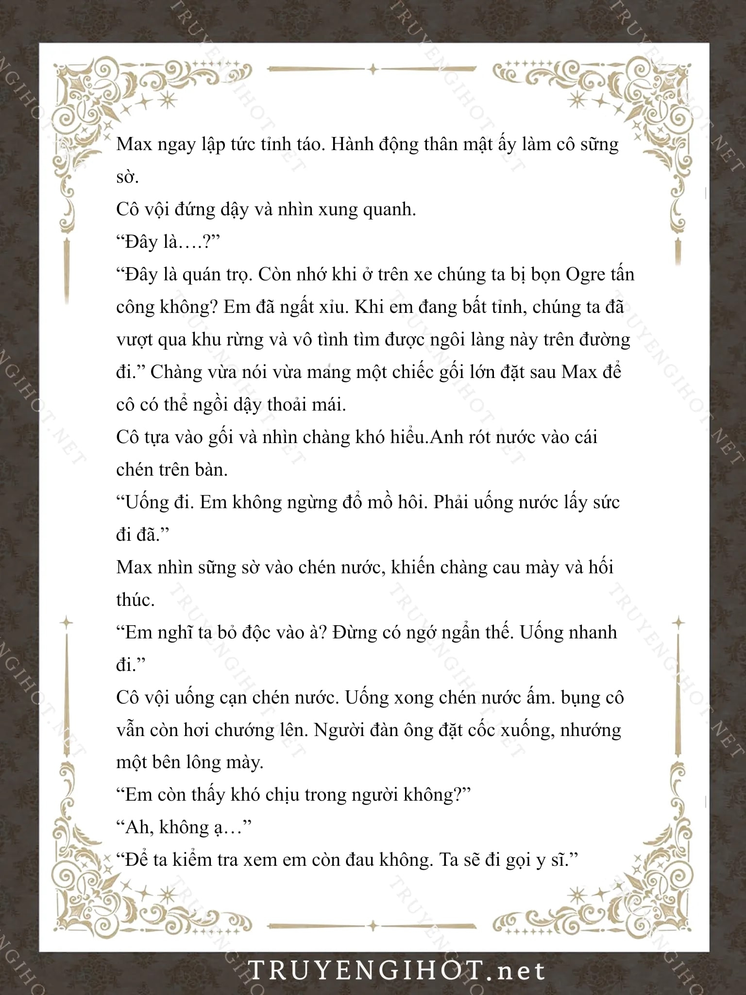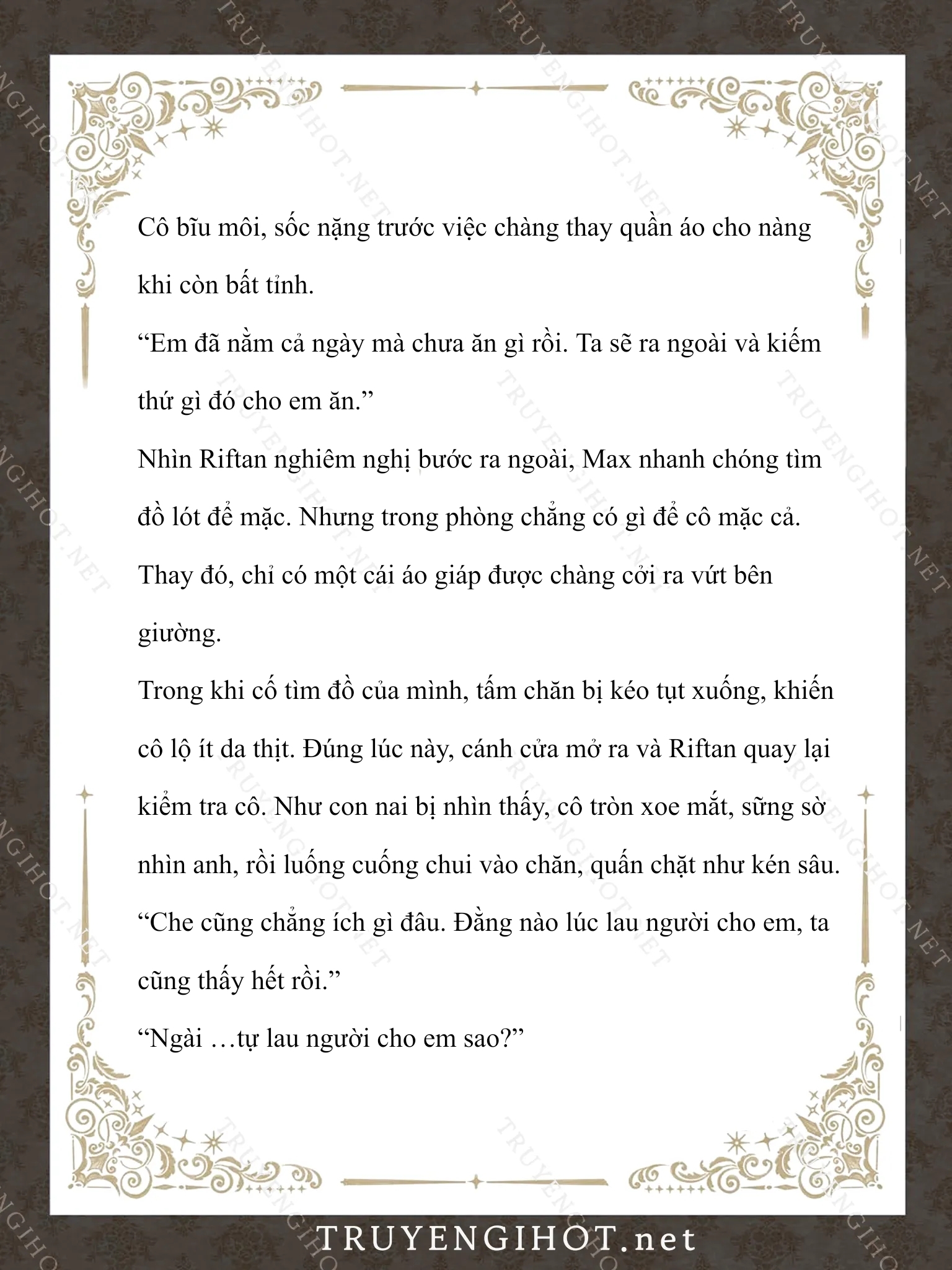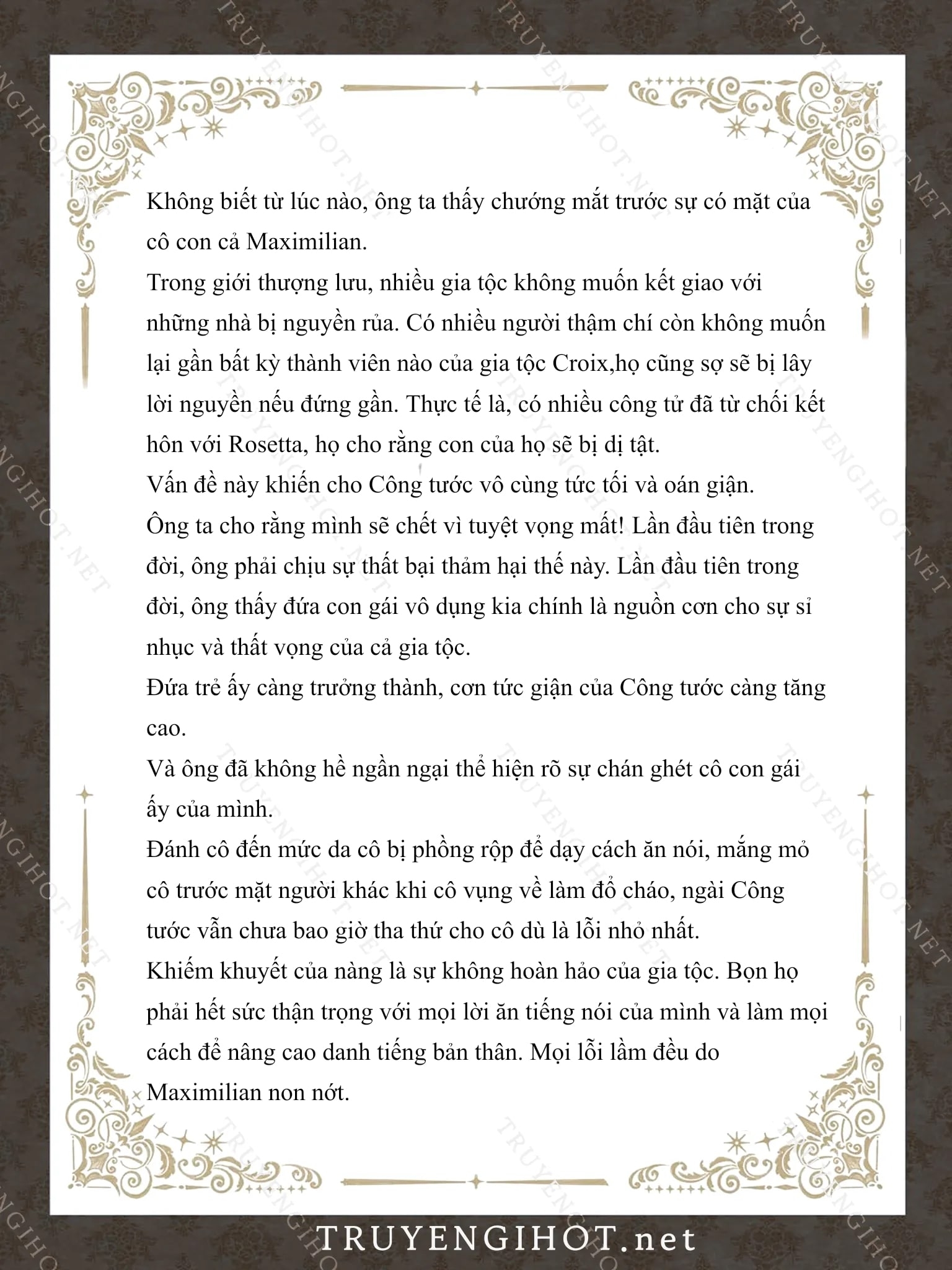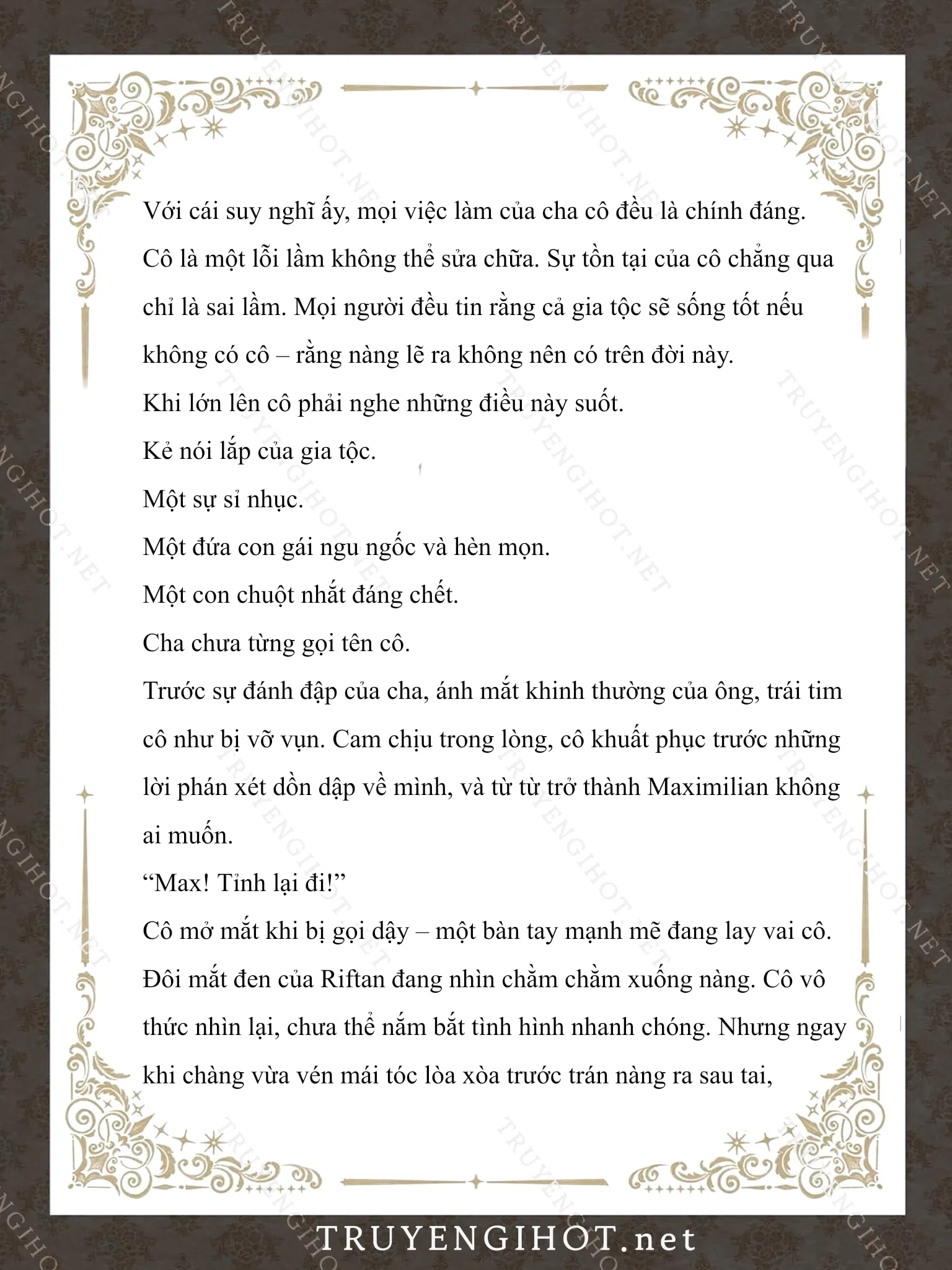 Maximilian Calypse lo lắng đi đi lại lại trong phòng tranh. Nàng căng thẳng đến mức vô thức cắn móng tay, rồi công tước xứ Cross đột nhiên bước vào. Nghe thấy tiếng gậy của ông đập trên sàn nhà, Max đã vội giấu tay ra sau lưng. “Tao đã cảnh cáo mày bao nhiêu lần về cái thói quen cắn móng tay tởm lợm đó rồi hả?!” “Con, con xin lỗi…” Max cúi đầu thấp đầu trước giọng nói lạnh lùng của cha mình. Ngài công tước tậc lưỡi, đảo mắt một vòng quanh phòng. “Đừng có làm xấu mặt tao. Mày may mắn lắm mới có được những thứ này đấy. Tao sẽ không tha thứ cho cái thói quen bẩn thỉu đó của mày đâu!” Lưng nàng toát mồ hôi lạnh. nàng sợ đến cứng người, chật vật nói: “Thưa cha, con sẽ làm mọi thứ theo lời cha. Con sẽ.. chàng,ngay khi chàng đến…Không cần ngước lên nhìn, nàng cũng tưởng tượng ra khuôn mặt của cha cô hiện giờ. Mỗi khi nàng mở miệng, ông luôn nhìn nàng với ánh mắt chán ghét. Max cố nói chuyện một cách bình tĩnh nhất có thể: “Thưa cha, con sẽ cố, con sẽ cố ạ. Cuộc, cuộc hôn nhân này, cuộc…” “…