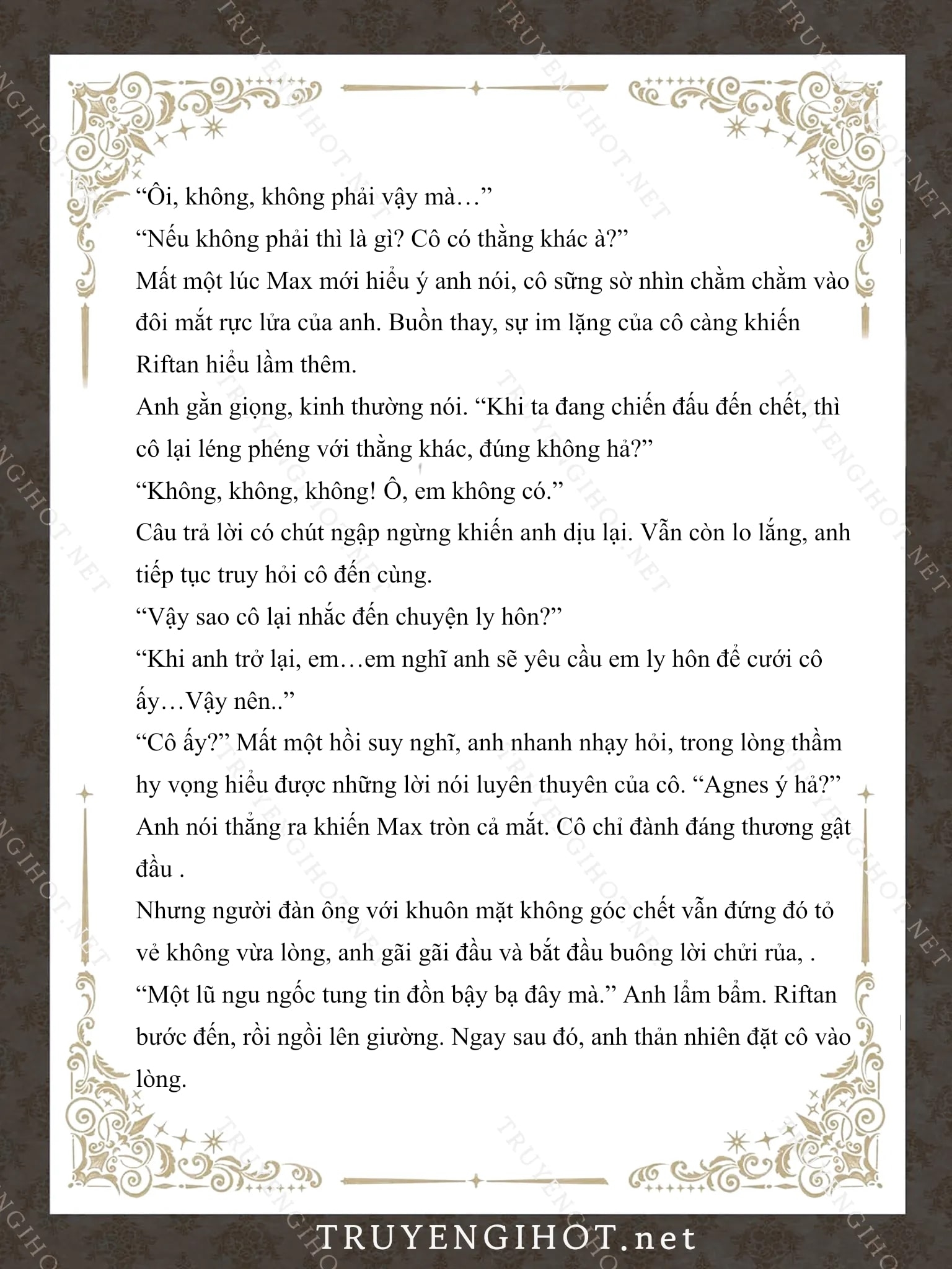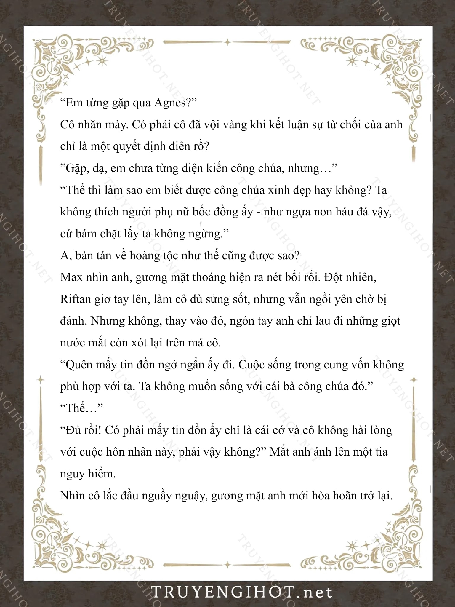 Maximilian Calypse lo lắng đi đi lại lại trong phòng tranh. Nàng căng thẳng đến mức vô thức cắn móng tay, rồi công tước xứ Cross đột nhiên bước vào. Nghe thấy tiếng gậy của ông đập trên sàn nhà, Max đã vội giấu tay ra sau lưng. “Tao đã cảnh cáo mày bao nhiêu lần về cái thói quen cắn móng tay tởm lợm đó rồi hả?!” “Con, con xin lỗi…” Max cúi đầu thấp đầu trước giọng nói lạnh lùng của cha mình. Ngài công tước tậc lưỡi, đảo mắt một vòng quanh phòng. “Đừng có làm xấu mặt tao. Mày may mắn lắm mới có được những thứ này đấy. Tao sẽ không tha thứ cho cái thói quen bẩn thỉu đó của mày đâu!” Lưng nàng toát mồ hôi lạnh. nàng sợ đến cứng người, chật vật nói: “Thưa cha, con sẽ làm mọi thứ theo lời cha. Con sẽ.. chàng,ngay khi chàng đến…Không cần ngước lên nhìn, nàng cũng tưởng tượng ra khuôn mặt của cha cô hiện giờ. Mỗi khi nàng mở miệng, ông luôn nhìn nàng với ánh mắt chán ghét. Max cố nói chuyện một cách bình tĩnh nhất có thể: “Thưa cha, con sẽ cố, con sẽ cố ạ. Cuộc, cuộc hôn nhân này, cuộc…” “…