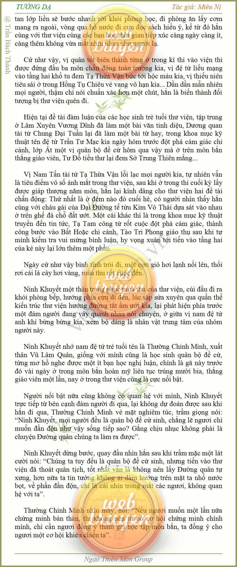 Tướng DạTruyện Converter, Truyện Huyền Huyễn, Truyện Kiếm Hiệp, Truyện Tiên HiệpTrên hoang nguyên trống trải bỗng xuất hiện ba người, cả ba đều không hẹn mà dừng chân dưới một thân cây còi cọc hiếm hoi, bọn họ không ai lên tiếng, chỉ im lặng cúi đầu nhìn xuống, tựa như dưới gốc cây có thứ gì đó rất thú vị, rất đáng để nghiên cứu và nghiền ngẫm. Hai đàn kiến vây kín quanh rễ cây màu nâu lộ ra trên mặt đất lạnh cóng tiến hành chiến tranh giành lãnh thổ, có lẽ vì trên mảnh hoang nguyên cằn cỗi vắng vẻ này chiếc rễ cây là một nơi trú ẩn tuyệt vời có một không hai nên trận chiến diễn ra hết sức khốc liệt, chỉ sau một lúc vài nghìn con kiến đã biến thành thi thể. Máu tanh là thế, nhưng thực tế trong mắt con người, vài nghìn xác kiến cũng chỉ là một mảng đen đen nhỏ xíu.Khí trời vẫn rất lạnh lẽo nhưng ba người đứng đó y phục lại khá mỏng manh, hình như họ không biết sợ lạnh là gì, cứ đứng bất động chăm chú quan sát. Không biết qua bao nhiêu lâu, bỗng một giọng khe khẽ cất lên:- Nước kiến nơi thế tục, đại đạo ra sao?Người vừa lên tiếng là một thiếu niên mặt mũi sáng sủa… *Chương này có nội dung ảnh, nếu bạn không thấy nội dung chương, vui lòng bật chế độ hiện hình ảnh của trình duyệt để đọc.