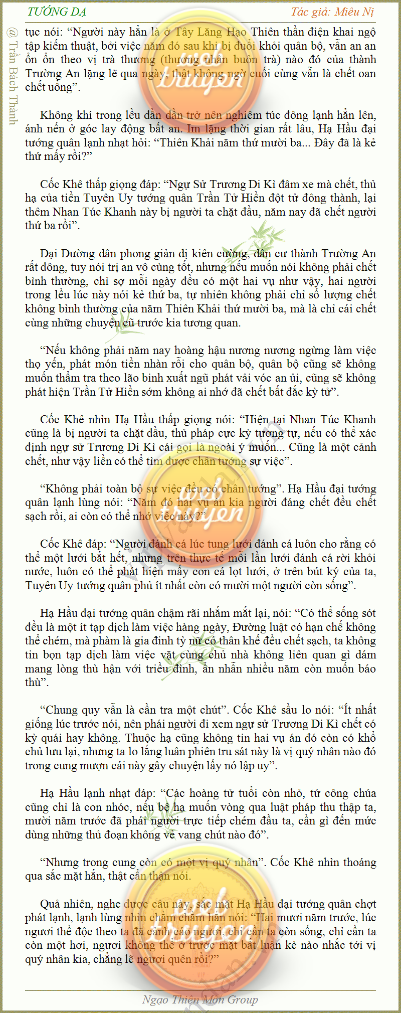 Tướng DạTruyện Converter, Truyện Huyền Huyễn, Truyện Kiếm Hiệp, Truyện Tiên HiệpTrên hoang nguyên trống trải bỗng xuất hiện ba người, cả ba đều không hẹn mà dừng chân dưới một thân cây còi cọc hiếm hoi, bọn họ không ai lên tiếng, chỉ im lặng cúi đầu nhìn xuống, tựa như dưới gốc cây có thứ gì đó rất thú vị, rất đáng để nghiên cứu và nghiền ngẫm. Hai đàn kiến vây kín quanh rễ cây màu nâu lộ ra trên mặt đất lạnh cóng tiến hành chiến tranh giành lãnh thổ, có lẽ vì trên mảnh hoang nguyên cằn cỗi vắng vẻ này chiếc rễ cây là một nơi trú ẩn tuyệt vời có một không hai nên trận chiến diễn ra hết sức khốc liệt, chỉ sau một lúc vài nghìn con kiến đã biến thành thi thể. Máu tanh là thế, nhưng thực tế trong mắt con người, vài nghìn xác kiến cũng chỉ là một mảng đen đen nhỏ xíu.Khí trời vẫn rất lạnh lẽo nhưng ba người đứng đó y phục lại khá mỏng manh, hình như họ không biết sợ lạnh là gì, cứ đứng bất động chăm chú quan sát. Không biết qua bao nhiêu lâu, bỗng một giọng khe khẽ cất lên:- Nước kiến nơi thế tục, đại đạo ra sao?Người vừa lên tiếng là một thiếu niên mặt mũi sáng sủa… *Chương này có nội dung ảnh, nếu bạn không thấy nội dung chương, vui lòng bật chế độ hiện hình ảnh của trình duyệt để đọc.