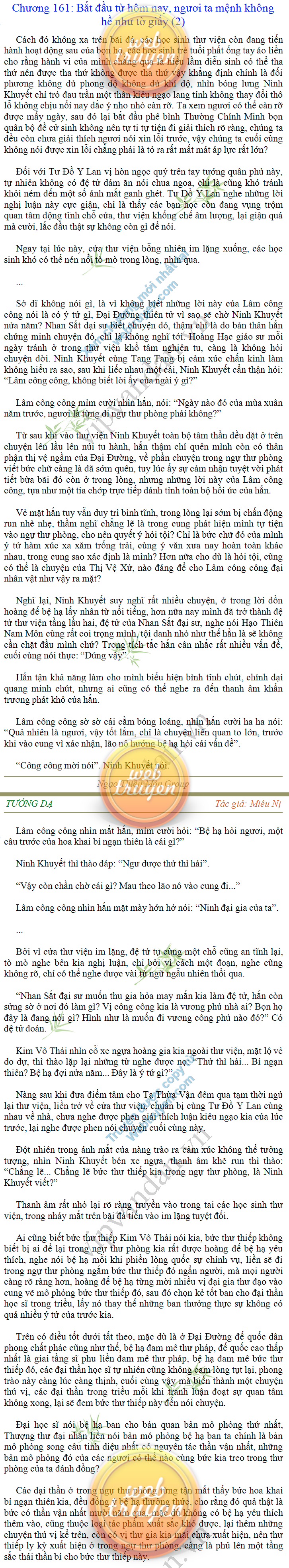 Tướng DạTruyện Converter, Truyện Huyền Huyễn, Truyện Kiếm Hiệp, Truyện Tiên HiệpTrên hoang nguyên trống trải bỗng xuất hiện ba người, cả ba đều không hẹn mà dừng chân dưới một thân cây còi cọc hiếm hoi, bọn họ không ai lên tiếng, chỉ im lặng cúi đầu nhìn xuống, tựa như dưới gốc cây có thứ gì đó rất thú vị, rất đáng để nghiên cứu và nghiền ngẫm. Hai đàn kiến vây kín quanh rễ cây màu nâu lộ ra trên mặt đất lạnh cóng tiến hành chiến tranh giành lãnh thổ, có lẽ vì trên mảnh hoang nguyên cằn cỗi vắng vẻ này chiếc rễ cây là một nơi trú ẩn tuyệt vời có một không hai nên trận chiến diễn ra hết sức khốc liệt, chỉ sau một lúc vài nghìn con kiến đã biến thành thi thể. Máu tanh là thế, nhưng thực tế trong mắt con người, vài nghìn xác kiến cũng chỉ là một mảng đen đen nhỏ xíu.Khí trời vẫn rất lạnh lẽo nhưng ba người đứng đó y phục lại khá mỏng manh, hình như họ không biết sợ lạnh là gì, cứ đứng bất động chăm chú quan sát. Không biết qua bao nhiêu lâu, bỗng một giọng khe khẽ cất lên:- Nước kiến nơi thế tục, đại đạo ra sao?Người vừa lên tiếng là một thiếu niên mặt mũi sáng sủa… *Chương này có nội dung ảnh, nếu bạn không thấy nội dung chương, vui lòng bật chế độ hiện hình ảnh của trình duyệt để đọc.
