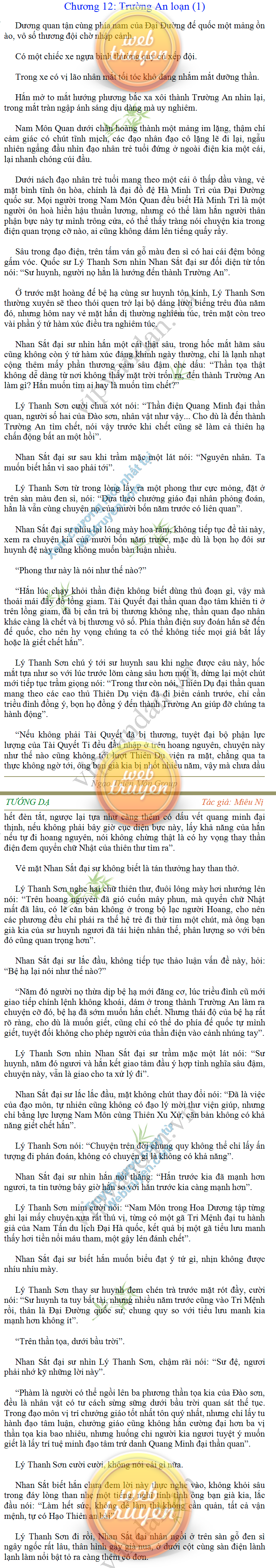 Tướng DạTruyện Converter, Truyện Huyền Huyễn, Truyện Kiếm Hiệp, Truyện Tiên HiệpTrên hoang nguyên trống trải bỗng xuất hiện ba người, cả ba đều không hẹn mà dừng chân dưới một thân cây còi cọc hiếm hoi, bọn họ không ai lên tiếng, chỉ im lặng cúi đầu nhìn xuống, tựa như dưới gốc cây có thứ gì đó rất thú vị, rất đáng để nghiên cứu và nghiền ngẫm. Hai đàn kiến vây kín quanh rễ cây màu nâu lộ ra trên mặt đất lạnh cóng tiến hành chiến tranh giành lãnh thổ, có lẽ vì trên mảnh hoang nguyên cằn cỗi vắng vẻ này chiếc rễ cây là một nơi trú ẩn tuyệt vời có một không hai nên trận chiến diễn ra hết sức khốc liệt, chỉ sau một lúc vài nghìn con kiến đã biến thành thi thể. Máu tanh là thế, nhưng thực tế trong mắt con người, vài nghìn xác kiến cũng chỉ là một mảng đen đen nhỏ xíu.Khí trời vẫn rất lạnh lẽo nhưng ba người đứng đó y phục lại khá mỏng manh, hình như họ không biết sợ lạnh là gì, cứ đứng bất động chăm chú quan sát. Không biết qua bao nhiêu lâu, bỗng một giọng khe khẽ cất lên:- Nước kiến nơi thế tục, đại đạo ra sao?Người vừa lên tiếng là một thiếu niên mặt mũi sáng sủa… *Chương này có nội dung ảnh, nếu bạn không thấy nội dung chương, vui lòng bật chế độ hiện hình ảnh của trình duyệt để đọc.