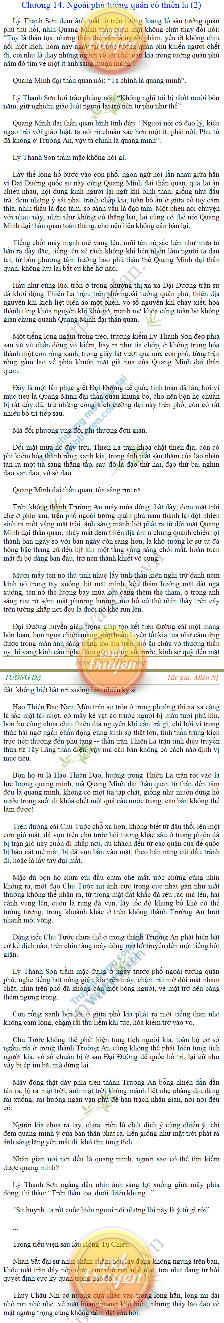Tướng DạTruyện Converter, Truyện Huyền Huyễn, Truyện Kiếm Hiệp, Truyện Tiên HiệpTrên hoang nguyên trống trải bỗng xuất hiện ba người, cả ba đều không hẹn mà dừng chân dưới một thân cây còi cọc hiếm hoi, bọn họ không ai lên tiếng, chỉ im lặng cúi đầu nhìn xuống, tựa như dưới gốc cây có thứ gì đó rất thú vị, rất đáng để nghiên cứu và nghiền ngẫm. Hai đàn kiến vây kín quanh rễ cây màu nâu lộ ra trên mặt đất lạnh cóng tiến hành chiến tranh giành lãnh thổ, có lẽ vì trên mảnh hoang nguyên cằn cỗi vắng vẻ này chiếc rễ cây là một nơi trú ẩn tuyệt vời có một không hai nên trận chiến diễn ra hết sức khốc liệt, chỉ sau một lúc vài nghìn con kiến đã biến thành thi thể. Máu tanh là thế, nhưng thực tế trong mắt con người, vài nghìn xác kiến cũng chỉ là một mảng đen đen nhỏ xíu.Khí trời vẫn rất lạnh lẽo nhưng ba người đứng đó y phục lại khá mỏng manh, hình như họ không biết sợ lạnh là gì, cứ đứng bất động chăm chú quan sát. Không biết qua bao nhiêu lâu, bỗng một giọng khe khẽ cất lên:- Nước kiến nơi thế tục, đại đạo ra sao?Người vừa lên tiếng là một thiếu niên mặt mũi sáng sủa… *Chương này có nội dung ảnh, nếu bạn không thấy nội dung chương, vui lòng bật chế độ hiện hình ảnh của trình duyệt để đọc.