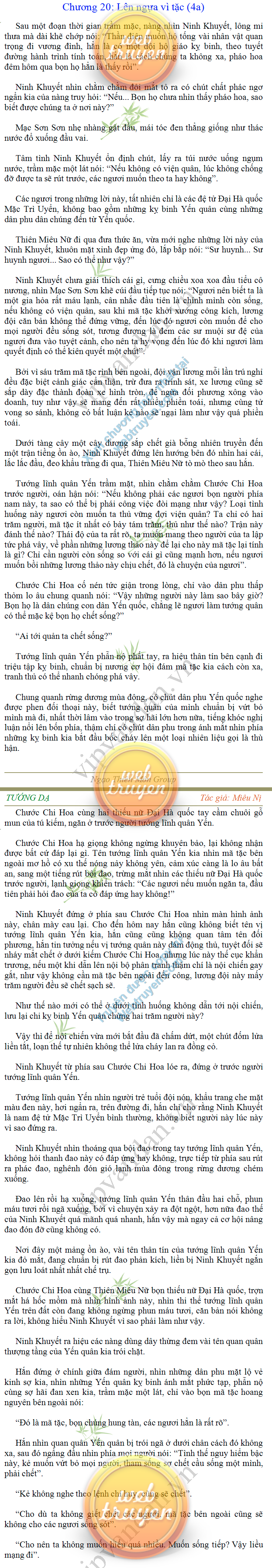 Tướng DạTruyện Converter, Truyện Huyền Huyễn, Truyện Kiếm Hiệp, Truyện Tiên HiệpTrên hoang nguyên trống trải bỗng xuất hiện ba người, cả ba đều không hẹn mà dừng chân dưới một thân cây còi cọc hiếm hoi, bọn họ không ai lên tiếng, chỉ im lặng cúi đầu nhìn xuống, tựa như dưới gốc cây có thứ gì đó rất thú vị, rất đáng để nghiên cứu và nghiền ngẫm. Hai đàn kiến vây kín quanh rễ cây màu nâu lộ ra trên mặt đất lạnh cóng tiến hành chiến tranh giành lãnh thổ, có lẽ vì trên mảnh hoang nguyên cằn cỗi vắng vẻ này chiếc rễ cây là một nơi trú ẩn tuyệt vời có một không hai nên trận chiến diễn ra hết sức khốc liệt, chỉ sau một lúc vài nghìn con kiến đã biến thành thi thể. Máu tanh là thế, nhưng thực tế trong mắt con người, vài nghìn xác kiến cũng chỉ là một mảng đen đen nhỏ xíu.Khí trời vẫn rất lạnh lẽo nhưng ba người đứng đó y phục lại khá mỏng manh, hình như họ không biết sợ lạnh là gì, cứ đứng bất động chăm chú quan sát. Không biết qua bao nhiêu lâu, bỗng một giọng khe khẽ cất lên:- Nước kiến nơi thế tục, đại đạo ra sao?Người vừa lên tiếng là một thiếu niên mặt mũi sáng sủa… *Chương này có nội dung ảnh, nếu bạn không thấy nội dung chương, vui lòng bật chế độ hiện hình ảnh của trình duyệt để đọc.