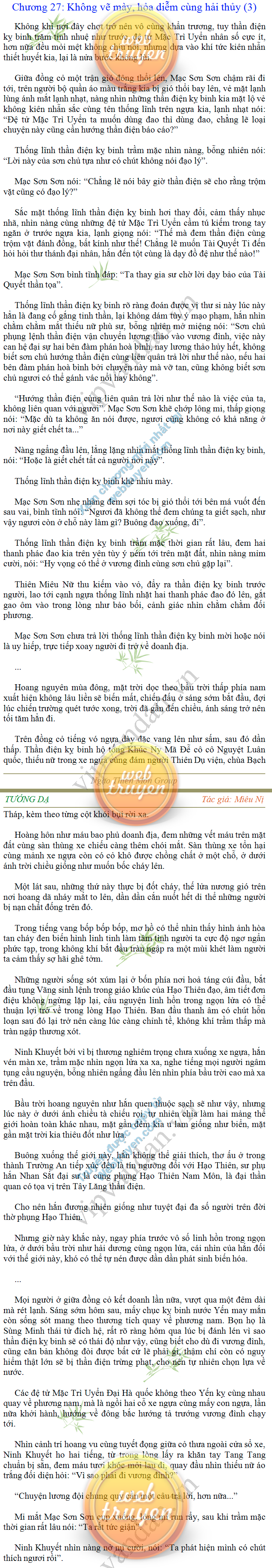 Tướng DạTruyện Converter, Truyện Huyền Huyễn, Truyện Kiếm Hiệp, Truyện Tiên HiệpTrên hoang nguyên trống trải bỗng xuất hiện ba người, cả ba đều không hẹn mà dừng chân dưới một thân cây còi cọc hiếm hoi, bọn họ không ai lên tiếng, chỉ im lặng cúi đầu nhìn xuống, tựa như dưới gốc cây có thứ gì đó rất thú vị, rất đáng để nghiên cứu và nghiền ngẫm. Hai đàn kiến vây kín quanh rễ cây màu nâu lộ ra trên mặt đất lạnh cóng tiến hành chiến tranh giành lãnh thổ, có lẽ vì trên mảnh hoang nguyên cằn cỗi vắng vẻ này chiếc rễ cây là một nơi trú ẩn tuyệt vời có một không hai nên trận chiến diễn ra hết sức khốc liệt, chỉ sau một lúc vài nghìn con kiến đã biến thành thi thể. Máu tanh là thế, nhưng thực tế trong mắt con người, vài nghìn xác kiến cũng chỉ là một mảng đen đen nhỏ xíu.Khí trời vẫn rất lạnh lẽo nhưng ba người đứng đó y phục lại khá mỏng manh, hình như họ không biết sợ lạnh là gì, cứ đứng bất động chăm chú quan sát. Không biết qua bao nhiêu lâu, bỗng một giọng khe khẽ cất lên:- Nước kiến nơi thế tục, đại đạo ra sao?Người vừa lên tiếng là một thiếu niên mặt mũi sáng sủa… *Chương này có nội dung ảnh, nếu bạn không thấy nội dung chương, vui lòng bật chế độ hiện hình ảnh của trình duyệt để đọc.