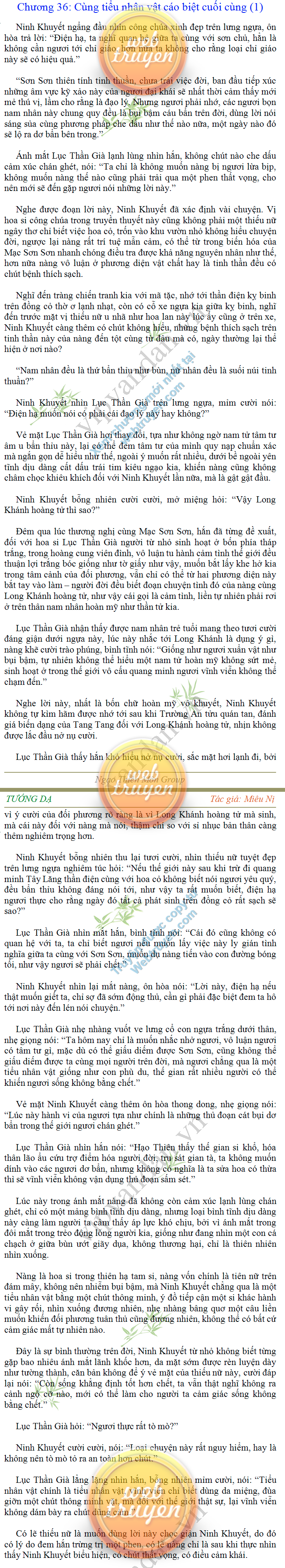 Tướng DạTruyện Converter, Truyện Huyền Huyễn, Truyện Kiếm Hiệp, Truyện Tiên HiệpTrên hoang nguyên trống trải bỗng xuất hiện ba người, cả ba đều không hẹn mà dừng chân dưới một thân cây còi cọc hiếm hoi, bọn họ không ai lên tiếng, chỉ im lặng cúi đầu nhìn xuống, tựa như dưới gốc cây có thứ gì đó rất thú vị, rất đáng để nghiên cứu và nghiền ngẫm. Hai đàn kiến vây kín quanh rễ cây màu nâu lộ ra trên mặt đất lạnh cóng tiến hành chiến tranh giành lãnh thổ, có lẽ vì trên mảnh hoang nguyên cằn cỗi vắng vẻ này chiếc rễ cây là một nơi trú ẩn tuyệt vời có một không hai nên trận chiến diễn ra hết sức khốc liệt, chỉ sau một lúc vài nghìn con kiến đã biến thành thi thể. Máu tanh là thế, nhưng thực tế trong mắt con người, vài nghìn xác kiến cũng chỉ là một mảng đen đen nhỏ xíu.Khí trời vẫn rất lạnh lẽo nhưng ba người đứng đó y phục lại khá mỏng manh, hình như họ không biết sợ lạnh là gì, cứ đứng bất động chăm chú quan sát. Không biết qua bao nhiêu lâu, bỗng một giọng khe khẽ cất lên:- Nước kiến nơi thế tục, đại đạo ra sao?Người vừa lên tiếng là một thiếu niên mặt mũi sáng sủa… *Chương này có nội dung ảnh, nếu bạn không thấy nội dung chương, vui lòng bật chế độ hiện hình ảnh của trình duyệt để đọc.