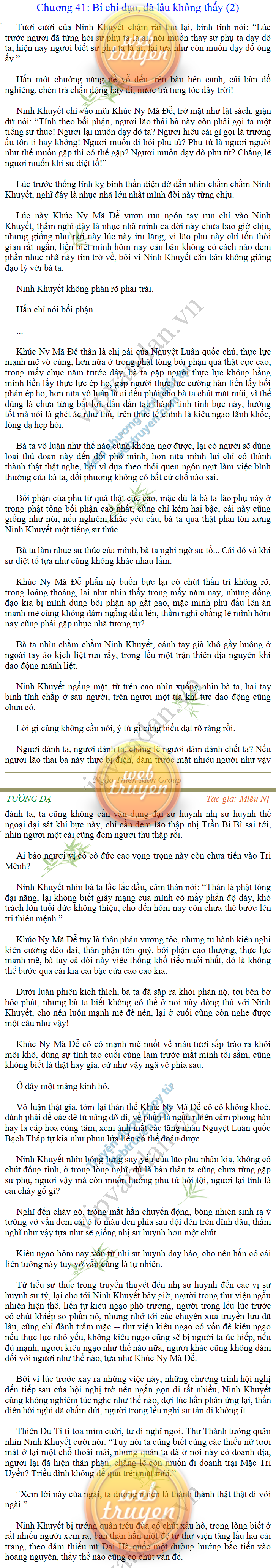Tướng DạTruyện Converter, Truyện Huyền Huyễn, Truyện Kiếm Hiệp, Truyện Tiên HiệpTrên hoang nguyên trống trải bỗng xuất hiện ba người, cả ba đều không hẹn mà dừng chân dưới một thân cây còi cọc hiếm hoi, bọn họ không ai lên tiếng, chỉ im lặng cúi đầu nhìn xuống, tựa như dưới gốc cây có thứ gì đó rất thú vị, rất đáng để nghiên cứu và nghiền ngẫm. Hai đàn kiến vây kín quanh rễ cây màu nâu lộ ra trên mặt đất lạnh cóng tiến hành chiến tranh giành lãnh thổ, có lẽ vì trên mảnh hoang nguyên cằn cỗi vắng vẻ này chiếc rễ cây là một nơi trú ẩn tuyệt vời có một không hai nên trận chiến diễn ra hết sức khốc liệt, chỉ sau một lúc vài nghìn con kiến đã biến thành thi thể. Máu tanh là thế, nhưng thực tế trong mắt con người, vài nghìn xác kiến cũng chỉ là một mảng đen đen nhỏ xíu.Khí trời vẫn rất lạnh lẽo nhưng ba người đứng đó y phục lại khá mỏng manh, hình như họ không biết sợ lạnh là gì, cứ đứng bất động chăm chú quan sát. Không biết qua bao nhiêu lâu, bỗng một giọng khe khẽ cất lên:- Nước kiến nơi thế tục, đại đạo ra sao?Người vừa lên tiếng là một thiếu niên mặt mũi sáng sủa… *Chương này có nội dung ảnh, nếu bạn không thấy nội dung chương, vui lòng bật chế độ hiện hình ảnh của trình duyệt để đọc.