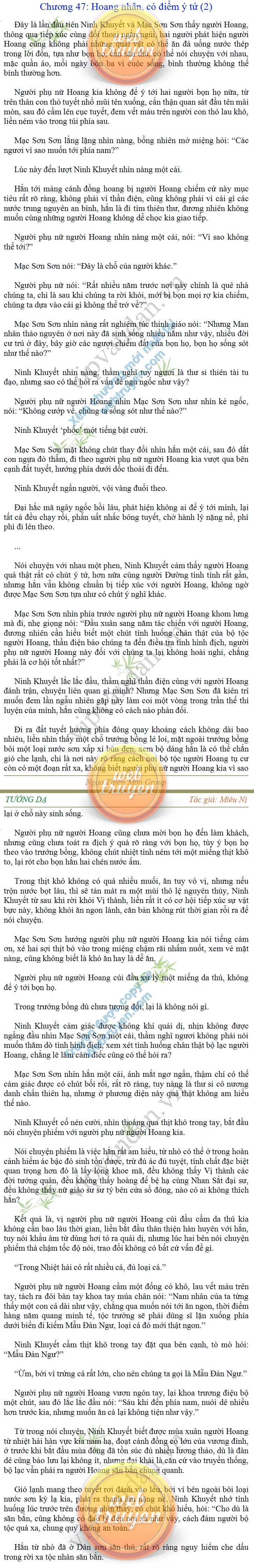 Tướng DạTruyện Converter, Truyện Huyền Huyễn, Truyện Kiếm Hiệp, Truyện Tiên HiệpTrên hoang nguyên trống trải bỗng xuất hiện ba người, cả ba đều không hẹn mà dừng chân dưới một thân cây còi cọc hiếm hoi, bọn họ không ai lên tiếng, chỉ im lặng cúi đầu nhìn xuống, tựa như dưới gốc cây có thứ gì đó rất thú vị, rất đáng để nghiên cứu và nghiền ngẫm. Hai đàn kiến vây kín quanh rễ cây màu nâu lộ ra trên mặt đất lạnh cóng tiến hành chiến tranh giành lãnh thổ, có lẽ vì trên mảnh hoang nguyên cằn cỗi vắng vẻ này chiếc rễ cây là một nơi trú ẩn tuyệt vời có một không hai nên trận chiến diễn ra hết sức khốc liệt, chỉ sau một lúc vài nghìn con kiến đã biến thành thi thể. Máu tanh là thế, nhưng thực tế trong mắt con người, vài nghìn xác kiến cũng chỉ là một mảng đen đen nhỏ xíu.Khí trời vẫn rất lạnh lẽo nhưng ba người đứng đó y phục lại khá mỏng manh, hình như họ không biết sợ lạnh là gì, cứ đứng bất động chăm chú quan sát. Không biết qua bao nhiêu lâu, bỗng một giọng khe khẽ cất lên:- Nước kiến nơi thế tục, đại đạo ra sao?Người vừa lên tiếng là một thiếu niên mặt mũi sáng sủa… *Chương này có nội dung ảnh, nếu bạn không thấy nội dung chương, vui lòng bật chế độ hiện hình ảnh của trình duyệt để đọc.