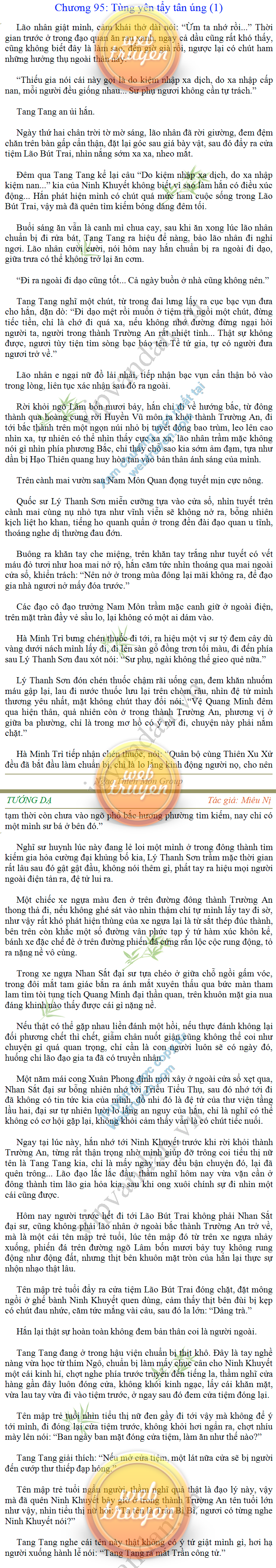Tướng DạTruyện Converter, Truyện Huyền Huyễn, Truyện Kiếm Hiệp, Truyện Tiên HiệpTrên hoang nguyên trống trải bỗng xuất hiện ba người, cả ba đều không hẹn mà dừng chân dưới một thân cây còi cọc hiếm hoi, bọn họ không ai lên tiếng, chỉ im lặng cúi đầu nhìn xuống, tựa như dưới gốc cây có thứ gì đó rất thú vị, rất đáng để nghiên cứu và nghiền ngẫm. Hai đàn kiến vây kín quanh rễ cây màu nâu lộ ra trên mặt đất lạnh cóng tiến hành chiến tranh giành lãnh thổ, có lẽ vì trên mảnh hoang nguyên cằn cỗi vắng vẻ này chiếc rễ cây là một nơi trú ẩn tuyệt vời có một không hai nên trận chiến diễn ra hết sức khốc liệt, chỉ sau một lúc vài nghìn con kiến đã biến thành thi thể. Máu tanh là thế, nhưng thực tế trong mắt con người, vài nghìn xác kiến cũng chỉ là một mảng đen đen nhỏ xíu.Khí trời vẫn rất lạnh lẽo nhưng ba người đứng đó y phục lại khá mỏng manh, hình như họ không biết sợ lạnh là gì, cứ đứng bất động chăm chú quan sát. Không biết qua bao nhiêu lâu, bỗng một giọng khe khẽ cất lên:- Nước kiến nơi thế tục, đại đạo ra sao?Người vừa lên tiếng là một thiếu niên mặt mũi sáng sủa… *Chương này có nội dung ảnh, nếu bạn không thấy nội dung chương, vui lòng bật chế độ hiện hình ảnh của trình duyệt để đọc.