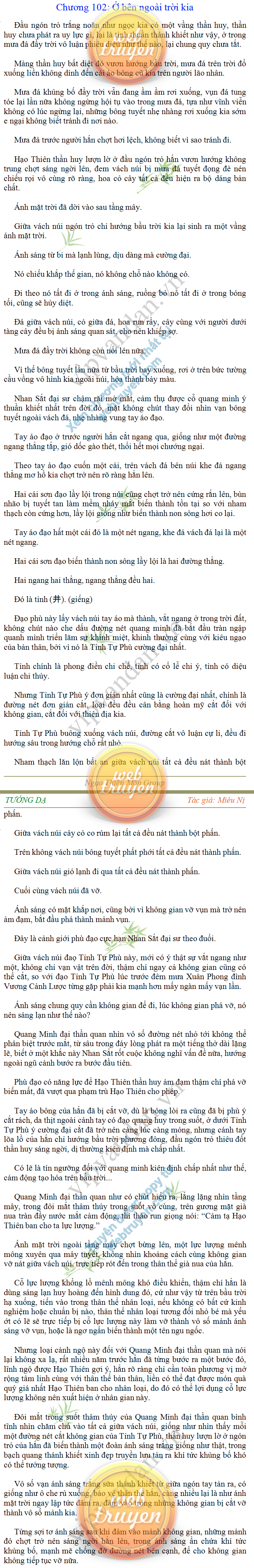 Tướng DạTruyện Converter, Truyện Huyền Huyễn, Truyện Kiếm Hiệp, Truyện Tiên HiệpTrên hoang nguyên trống trải bỗng xuất hiện ba người, cả ba đều không hẹn mà dừng chân dưới một thân cây còi cọc hiếm hoi, bọn họ không ai lên tiếng, chỉ im lặng cúi đầu nhìn xuống, tựa như dưới gốc cây có thứ gì đó rất thú vị, rất đáng để nghiên cứu và nghiền ngẫm. Hai đàn kiến vây kín quanh rễ cây màu nâu lộ ra trên mặt đất lạnh cóng tiến hành chiến tranh giành lãnh thổ, có lẽ vì trên mảnh hoang nguyên cằn cỗi vắng vẻ này chiếc rễ cây là một nơi trú ẩn tuyệt vời có một không hai nên trận chiến diễn ra hết sức khốc liệt, chỉ sau một lúc vài nghìn con kiến đã biến thành thi thể. Máu tanh là thế, nhưng thực tế trong mắt con người, vài nghìn xác kiến cũng chỉ là một mảng đen đen nhỏ xíu.Khí trời vẫn rất lạnh lẽo nhưng ba người đứng đó y phục lại khá mỏng manh, hình như họ không biết sợ lạnh là gì, cứ đứng bất động chăm chú quan sát. Không biết qua bao nhiêu lâu, bỗng một giọng khe khẽ cất lên:- Nước kiến nơi thế tục, đại đạo ra sao?Người vừa lên tiếng là một thiếu niên mặt mũi sáng sủa… *Chương này có nội dung ảnh, nếu bạn không thấy nội dung chương, vui lòng bật chế độ hiện hình ảnh của trình duyệt để đọc.
