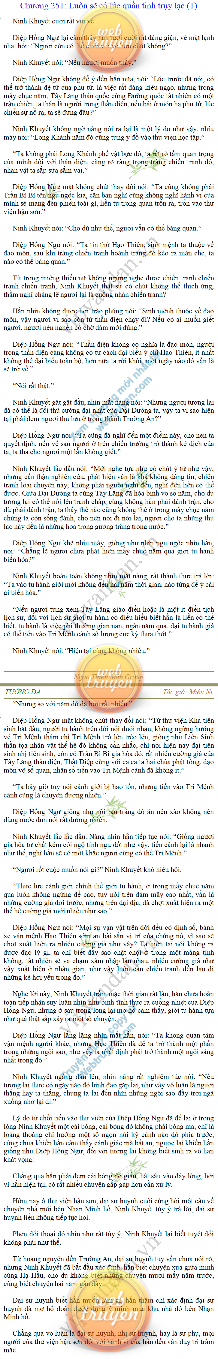 Tướng DạTruyện Converter, Truyện Huyền Huyễn, Truyện Kiếm Hiệp, Truyện Tiên HiệpTrên hoang nguyên trống trải bỗng xuất hiện ba người, cả ba đều không hẹn mà dừng chân dưới một thân cây còi cọc hiếm hoi, bọn họ không ai lên tiếng, chỉ im lặng cúi đầu nhìn xuống, tựa như dưới gốc cây có thứ gì đó rất thú vị, rất đáng để nghiên cứu và nghiền ngẫm. Hai đàn kiến vây kín quanh rễ cây màu nâu lộ ra trên mặt đất lạnh cóng tiến hành chiến tranh giành lãnh thổ, có lẽ vì trên mảnh hoang nguyên cằn cỗi vắng vẻ này chiếc rễ cây là một nơi trú ẩn tuyệt vời có một không hai nên trận chiến diễn ra hết sức khốc liệt, chỉ sau một lúc vài nghìn con kiến đã biến thành thi thể. Máu tanh là thế, nhưng thực tế trong mắt con người, vài nghìn xác kiến cũng chỉ là một mảng đen đen nhỏ xíu.Khí trời vẫn rất lạnh lẽo nhưng ba người đứng đó y phục lại khá mỏng manh, hình như họ không biết sợ lạnh là gì, cứ đứng bất động chăm chú quan sát. Không biết qua bao nhiêu lâu, bỗng một giọng khe khẽ cất lên:- Nước kiến nơi thế tục, đại đạo ra sao?Người vừa lên tiếng là một thiếu niên mặt mũi sáng sủa… *Chương này có nội dung ảnh, nếu bạn không thấy nội dung chương, vui lòng bật chế độ hiện hình ảnh của trình duyệt để đọc.