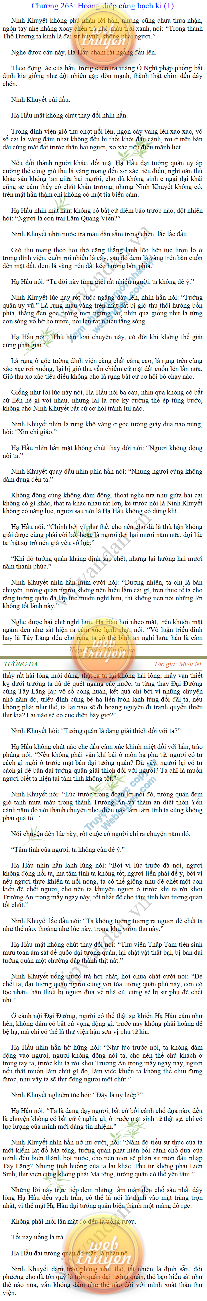 Tướng DạTruyện Converter, Truyện Huyền Huyễn, Truyện Kiếm Hiệp, Truyện Tiên HiệpTrên hoang nguyên trống trải bỗng xuất hiện ba người, cả ba đều không hẹn mà dừng chân dưới một thân cây còi cọc hiếm hoi, bọn họ không ai lên tiếng, chỉ im lặng cúi đầu nhìn xuống, tựa như dưới gốc cây có thứ gì đó rất thú vị, rất đáng để nghiên cứu và nghiền ngẫm. Hai đàn kiến vây kín quanh rễ cây màu nâu lộ ra trên mặt đất lạnh cóng tiến hành chiến tranh giành lãnh thổ, có lẽ vì trên mảnh hoang nguyên cằn cỗi vắng vẻ này chiếc rễ cây là một nơi trú ẩn tuyệt vời có một không hai nên trận chiến diễn ra hết sức khốc liệt, chỉ sau một lúc vài nghìn con kiến đã biến thành thi thể. Máu tanh là thế, nhưng thực tế trong mắt con người, vài nghìn xác kiến cũng chỉ là một mảng đen đen nhỏ xíu.Khí trời vẫn rất lạnh lẽo nhưng ba người đứng đó y phục lại khá mỏng manh, hình như họ không biết sợ lạnh là gì, cứ đứng bất động chăm chú quan sát. Không biết qua bao nhiêu lâu, bỗng một giọng khe khẽ cất lên:- Nước kiến nơi thế tục, đại đạo ra sao?Người vừa lên tiếng là một thiếu niên mặt mũi sáng sủa… *Chương này có nội dung ảnh, nếu bạn không thấy nội dung chương, vui lòng bật chế độ hiện hình ảnh của trình duyệt để đọc.