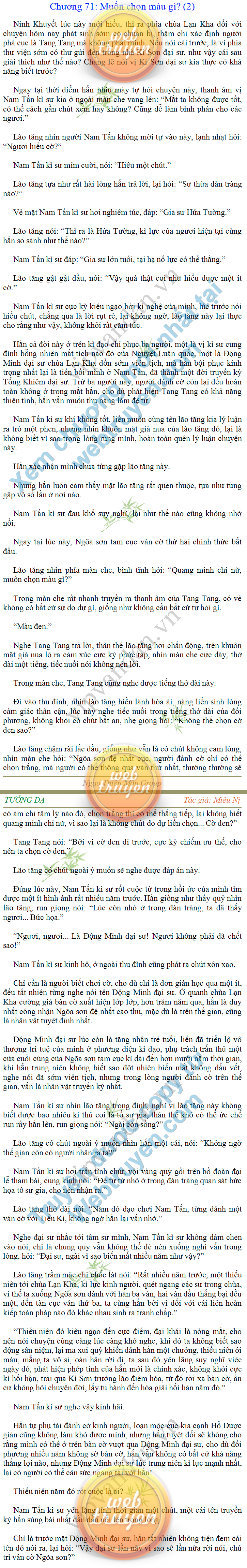 Tướng DạTruyện Converter, Truyện Huyền Huyễn, Truyện Kiếm Hiệp, Truyện Tiên HiệpTrên hoang nguyên trống trải bỗng xuất hiện ba người, cả ba đều không hẹn mà dừng chân dưới một thân cây còi cọc hiếm hoi, bọn họ không ai lên tiếng, chỉ im lặng cúi đầu nhìn xuống, tựa như dưới gốc cây có thứ gì đó rất thú vị, rất đáng để nghiên cứu và nghiền ngẫm. Hai đàn kiến vây kín quanh rễ cây màu nâu lộ ra trên mặt đất lạnh cóng tiến hành chiến tranh giành lãnh thổ, có lẽ vì trên mảnh hoang nguyên cằn cỗi vắng vẻ này chiếc rễ cây là một nơi trú ẩn tuyệt vời có một không hai nên trận chiến diễn ra hết sức khốc liệt, chỉ sau một lúc vài nghìn con kiến đã biến thành thi thể. Máu tanh là thế, nhưng thực tế trong mắt con người, vài nghìn xác kiến cũng chỉ là một mảng đen đen nhỏ xíu.Khí trời vẫn rất lạnh lẽo nhưng ba người đứng đó y phục lại khá mỏng manh, hình như họ không biết sợ lạnh là gì, cứ đứng bất động chăm chú quan sát. Không biết qua bao nhiêu lâu, bỗng một giọng khe khẽ cất lên:- Nước kiến nơi thế tục, đại đạo ra sao?Người vừa lên tiếng là một thiếu niên mặt mũi sáng sủa… *Chương này có nội dung ảnh, nếu bạn không thấy nội dung chương, vui lòng bật chế độ hiện hình ảnh của trình duyệt để đọc.