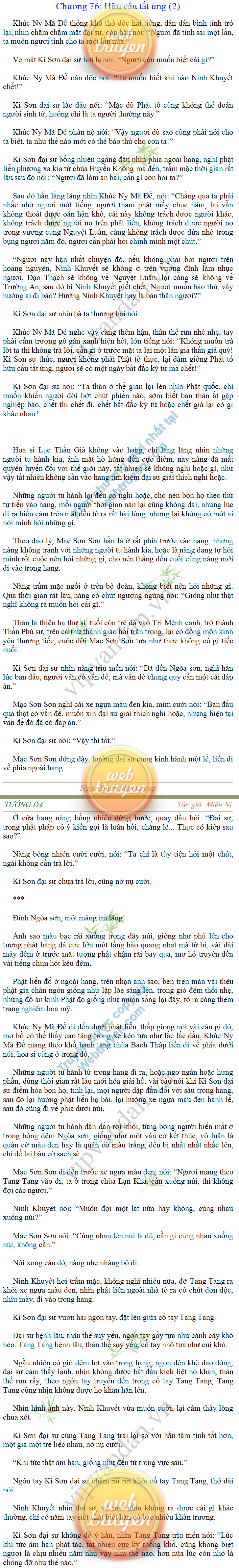 Tướng DạTruyện Converter, Truyện Huyền Huyễn, Truyện Kiếm Hiệp, Truyện Tiên HiệpTrên hoang nguyên trống trải bỗng xuất hiện ba người, cả ba đều không hẹn mà dừng chân dưới một thân cây còi cọc hiếm hoi, bọn họ không ai lên tiếng, chỉ im lặng cúi đầu nhìn xuống, tựa như dưới gốc cây có thứ gì đó rất thú vị, rất đáng để nghiên cứu và nghiền ngẫm. Hai đàn kiến vây kín quanh rễ cây màu nâu lộ ra trên mặt đất lạnh cóng tiến hành chiến tranh giành lãnh thổ, có lẽ vì trên mảnh hoang nguyên cằn cỗi vắng vẻ này chiếc rễ cây là một nơi trú ẩn tuyệt vời có một không hai nên trận chiến diễn ra hết sức khốc liệt, chỉ sau một lúc vài nghìn con kiến đã biến thành thi thể. Máu tanh là thế, nhưng thực tế trong mắt con người, vài nghìn xác kiến cũng chỉ là một mảng đen đen nhỏ xíu.Khí trời vẫn rất lạnh lẽo nhưng ba người đứng đó y phục lại khá mỏng manh, hình như họ không biết sợ lạnh là gì, cứ đứng bất động chăm chú quan sát. Không biết qua bao nhiêu lâu, bỗng một giọng khe khẽ cất lên:- Nước kiến nơi thế tục, đại đạo ra sao?Người vừa lên tiếng là một thiếu niên mặt mũi sáng sủa… *Chương này có nội dung ảnh, nếu bạn không thấy nội dung chương, vui lòng bật chế độ hiện hình ảnh của trình duyệt để đọc.