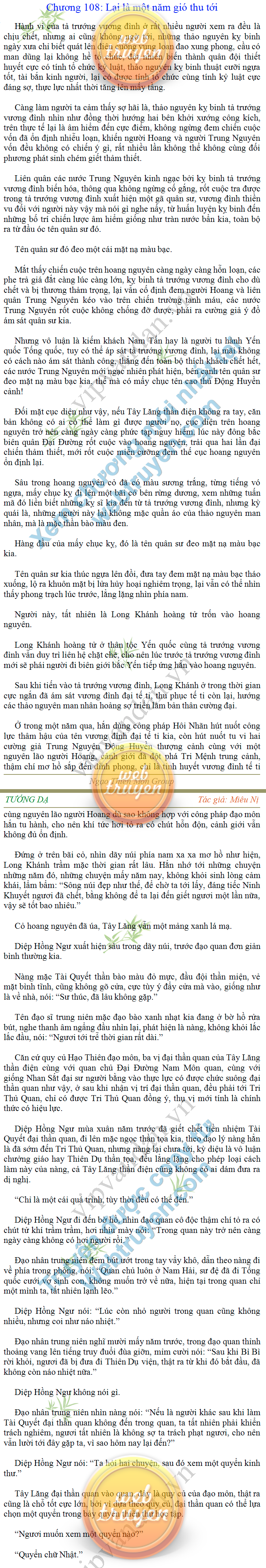 Tướng DạTruyện Converter, Truyện Huyền Huyễn, Truyện Kiếm Hiệp, Truyện Tiên HiệpTrên hoang nguyên trống trải bỗng xuất hiện ba người, cả ba đều không hẹn mà dừng chân dưới một thân cây còi cọc hiếm hoi, bọn họ không ai lên tiếng, chỉ im lặng cúi đầu nhìn xuống, tựa như dưới gốc cây có thứ gì đó rất thú vị, rất đáng để nghiên cứu và nghiền ngẫm. Hai đàn kiến vây kín quanh rễ cây màu nâu lộ ra trên mặt đất lạnh cóng tiến hành chiến tranh giành lãnh thổ, có lẽ vì trên mảnh hoang nguyên cằn cỗi vắng vẻ này chiếc rễ cây là một nơi trú ẩn tuyệt vời có một không hai nên trận chiến diễn ra hết sức khốc liệt, chỉ sau một lúc vài nghìn con kiến đã biến thành thi thể. Máu tanh là thế, nhưng thực tế trong mắt con người, vài nghìn xác kiến cũng chỉ là một mảng đen đen nhỏ xíu.Khí trời vẫn rất lạnh lẽo nhưng ba người đứng đó y phục lại khá mỏng manh, hình như họ không biết sợ lạnh là gì, cứ đứng bất động chăm chú quan sát. Không biết qua bao nhiêu lâu, bỗng một giọng khe khẽ cất lên:- Nước kiến nơi thế tục, đại đạo ra sao?Người vừa lên tiếng là một thiếu niên mặt mũi sáng sủa… *Chương này có nội dung ảnh, nếu bạn không thấy nội dung chương, vui lòng bật chế độ hiện hình ảnh của trình duyệt để đọc.