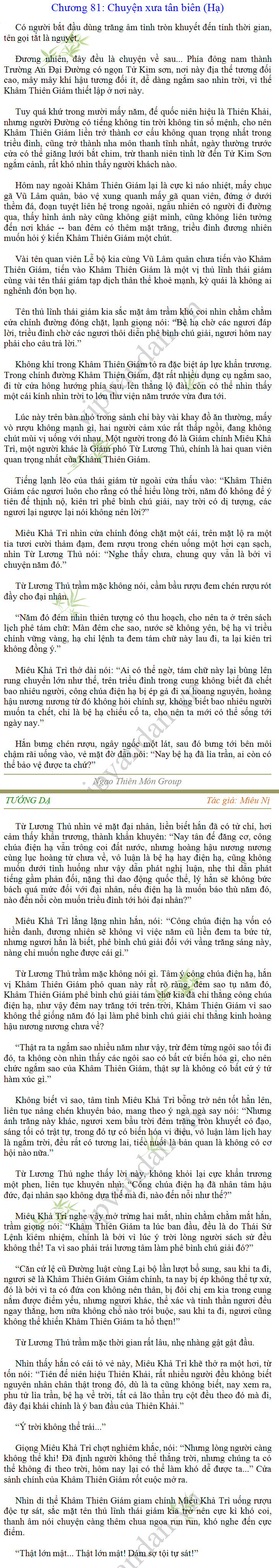 Tướng DạTruyện Converter, Truyện Huyền Huyễn, Truyện Kiếm Hiệp, Truyện Tiên HiệpTrên hoang nguyên trống trải bỗng xuất hiện ba người, cả ba đều không hẹn mà dừng chân dưới một thân cây còi cọc hiếm hoi, bọn họ không ai lên tiếng, chỉ im lặng cúi đầu nhìn xuống, tựa như dưới gốc cây có thứ gì đó rất thú vị, rất đáng để nghiên cứu và nghiền ngẫm. Hai đàn kiến vây kín quanh rễ cây màu nâu lộ ra trên mặt đất lạnh cóng tiến hành chiến tranh giành lãnh thổ, có lẽ vì trên mảnh hoang nguyên cằn cỗi vắng vẻ này chiếc rễ cây là một nơi trú ẩn tuyệt vời có một không hai nên trận chiến diễn ra hết sức khốc liệt, chỉ sau một lúc vài nghìn con kiến đã biến thành thi thể. Máu tanh là thế, nhưng thực tế trong mắt con người, vài nghìn xác kiến cũng chỉ là một mảng đen đen nhỏ xíu.Khí trời vẫn rất lạnh lẽo nhưng ba người đứng đó y phục lại khá mỏng manh, hình như họ không biết sợ lạnh là gì, cứ đứng bất động chăm chú quan sát. Không biết qua bao nhiêu lâu, bỗng một giọng khe khẽ cất lên:- Nước kiến nơi thế tục, đại đạo ra sao?Người vừa lên tiếng là một thiếu niên mặt mũi sáng sủa… *Chương này có nội dung ảnh, nếu bạn không thấy nội dung chương, vui lòng bật chế độ hiện hình ảnh của trình duyệt để đọc.
