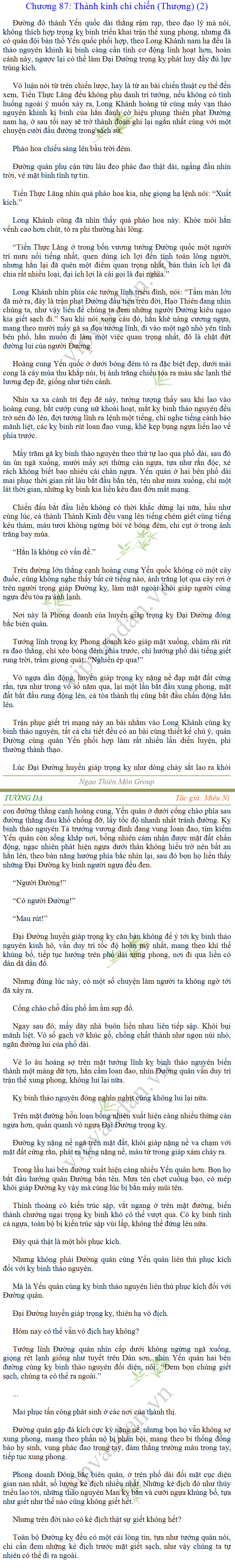 Tướng DạTruyện Converter, Truyện Huyền Huyễn, Truyện Kiếm Hiệp, Truyện Tiên HiệpTrên hoang nguyên trống trải bỗng xuất hiện ba người, cả ba đều không hẹn mà dừng chân dưới một thân cây còi cọc hiếm hoi, bọn họ không ai lên tiếng, chỉ im lặng cúi đầu nhìn xuống, tựa như dưới gốc cây có thứ gì đó rất thú vị, rất đáng để nghiên cứu và nghiền ngẫm. Hai đàn kiến vây kín quanh rễ cây màu nâu lộ ra trên mặt đất lạnh cóng tiến hành chiến tranh giành lãnh thổ, có lẽ vì trên mảnh hoang nguyên cằn cỗi vắng vẻ này chiếc rễ cây là một nơi trú ẩn tuyệt vời có một không hai nên trận chiến diễn ra hết sức khốc liệt, chỉ sau một lúc vài nghìn con kiến đã biến thành thi thể. Máu tanh là thế, nhưng thực tế trong mắt con người, vài nghìn xác kiến cũng chỉ là một mảng đen đen nhỏ xíu.Khí trời vẫn rất lạnh lẽo nhưng ba người đứng đó y phục lại khá mỏng manh, hình như họ không biết sợ lạnh là gì, cứ đứng bất động chăm chú quan sát. Không biết qua bao nhiêu lâu, bỗng một giọng khe khẽ cất lên:- Nước kiến nơi thế tục, đại đạo ra sao?Người vừa lên tiếng là một thiếu niên mặt mũi sáng sủa… *Chương này có nội dung ảnh, nếu bạn không thấy nội dung chương, vui lòng bật chế độ hiện hình ảnh của trình duyệt để đọc.