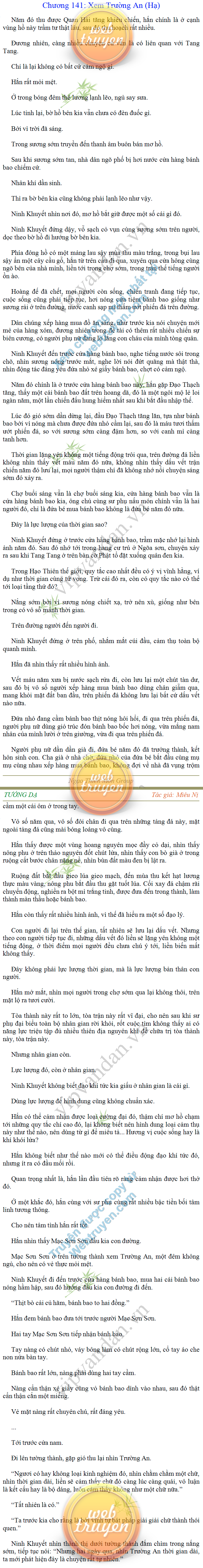 Tướng DạTruyện Converter, Truyện Huyền Huyễn, Truyện Kiếm Hiệp, Truyện Tiên HiệpTrên hoang nguyên trống trải bỗng xuất hiện ba người, cả ba đều không hẹn mà dừng chân dưới một thân cây còi cọc hiếm hoi, bọn họ không ai lên tiếng, chỉ im lặng cúi đầu nhìn xuống, tựa như dưới gốc cây có thứ gì đó rất thú vị, rất đáng để nghiên cứu và nghiền ngẫm. Hai đàn kiến vây kín quanh rễ cây màu nâu lộ ra trên mặt đất lạnh cóng tiến hành chiến tranh giành lãnh thổ, có lẽ vì trên mảnh hoang nguyên cằn cỗi vắng vẻ này chiếc rễ cây là một nơi trú ẩn tuyệt vời có một không hai nên trận chiến diễn ra hết sức khốc liệt, chỉ sau một lúc vài nghìn con kiến đã biến thành thi thể. Máu tanh là thế, nhưng thực tế trong mắt con người, vài nghìn xác kiến cũng chỉ là một mảng đen đen nhỏ xíu.Khí trời vẫn rất lạnh lẽo nhưng ba người đứng đó y phục lại khá mỏng manh, hình như họ không biết sợ lạnh là gì, cứ đứng bất động chăm chú quan sát. Không biết qua bao nhiêu lâu, bỗng một giọng khe khẽ cất lên:- Nước kiến nơi thế tục, đại đạo ra sao?Người vừa lên tiếng là một thiếu niên mặt mũi sáng sủa… *Chương này có nội dung ảnh, nếu bạn không thấy nội dung chương, vui lòng bật chế độ hiện hình ảnh của trình duyệt để đọc.