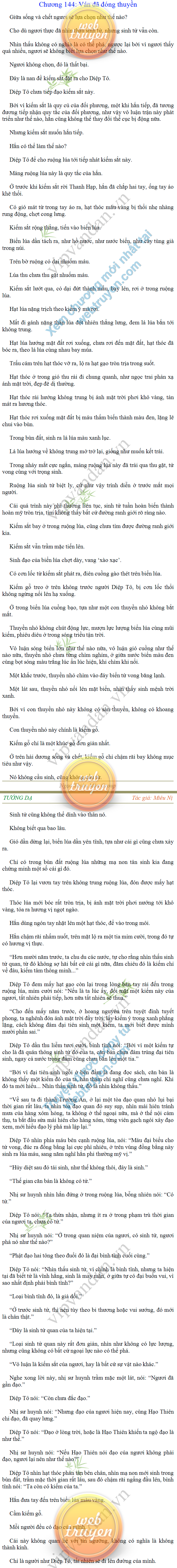 Tướng DạTruyện Converter, Truyện Huyền Huyễn, Truyện Kiếm Hiệp, Truyện Tiên HiệpTrên hoang nguyên trống trải bỗng xuất hiện ba người, cả ba đều không hẹn mà dừng chân dưới một thân cây còi cọc hiếm hoi, bọn họ không ai lên tiếng, chỉ im lặng cúi đầu nhìn xuống, tựa như dưới gốc cây có thứ gì đó rất thú vị, rất đáng để nghiên cứu và nghiền ngẫm. Hai đàn kiến vây kín quanh rễ cây màu nâu lộ ra trên mặt đất lạnh cóng tiến hành chiến tranh giành lãnh thổ, có lẽ vì trên mảnh hoang nguyên cằn cỗi vắng vẻ này chiếc rễ cây là một nơi trú ẩn tuyệt vời có một không hai nên trận chiến diễn ra hết sức khốc liệt, chỉ sau một lúc vài nghìn con kiến đã biến thành thi thể. Máu tanh là thế, nhưng thực tế trong mắt con người, vài nghìn xác kiến cũng chỉ là một mảng đen đen nhỏ xíu.Khí trời vẫn rất lạnh lẽo nhưng ba người đứng đó y phục lại khá mỏng manh, hình như họ không biết sợ lạnh là gì, cứ đứng bất động chăm chú quan sát. Không biết qua bao nhiêu lâu, bỗng một giọng khe khẽ cất lên:- Nước kiến nơi thế tục, đại đạo ra sao?Người vừa lên tiếng là một thiếu niên mặt mũi sáng sủa… *Chương này có nội dung ảnh, nếu bạn không thấy nội dung chương, vui lòng bật chế độ hiện hình ảnh của trình duyệt để đọc.