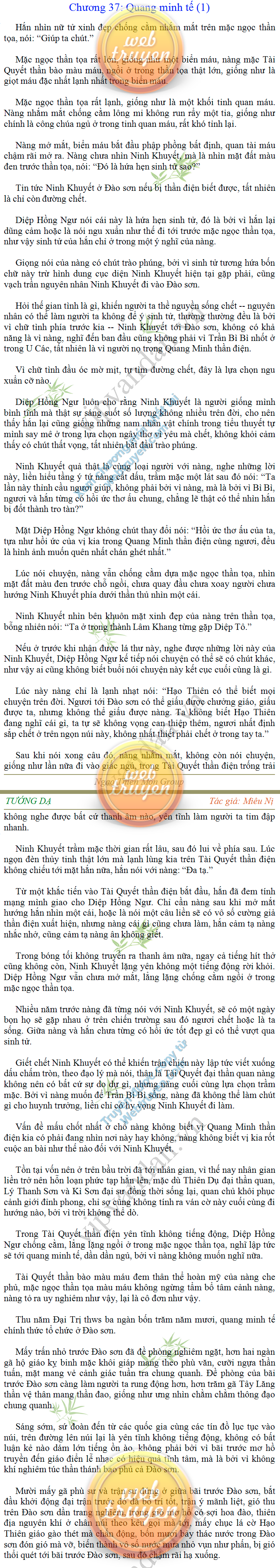 Tướng DạTruyện Converter, Truyện Huyền Huyễn, Truyện Kiếm Hiệp, Truyện Tiên HiệpTrên hoang nguyên trống trải bỗng xuất hiện ba người, cả ba đều không hẹn mà dừng chân dưới một thân cây còi cọc hiếm hoi, bọn họ không ai lên tiếng, chỉ im lặng cúi đầu nhìn xuống, tựa như dưới gốc cây có thứ gì đó rất thú vị, rất đáng để nghiên cứu và nghiền ngẫm. Hai đàn kiến vây kín quanh rễ cây màu nâu lộ ra trên mặt đất lạnh cóng tiến hành chiến tranh giành lãnh thổ, có lẽ vì trên mảnh hoang nguyên cằn cỗi vắng vẻ này chiếc rễ cây là một nơi trú ẩn tuyệt vời có một không hai nên trận chiến diễn ra hết sức khốc liệt, chỉ sau một lúc vài nghìn con kiến đã biến thành thi thể. Máu tanh là thế, nhưng thực tế trong mắt con người, vài nghìn xác kiến cũng chỉ là một mảng đen đen nhỏ xíu.Khí trời vẫn rất lạnh lẽo nhưng ba người đứng đó y phục lại khá mỏng manh, hình như họ không biết sợ lạnh là gì, cứ đứng bất động chăm chú quan sát. Không biết qua bao nhiêu lâu, bỗng một giọng khe khẽ cất lên:- Nước kiến nơi thế tục, đại đạo ra sao?Người vừa lên tiếng là một thiếu niên mặt mũi sáng sủa… *Chương này có nội dung ảnh, nếu bạn không thấy nội dung chương, vui lòng bật chế độ hiện hình ảnh của trình duyệt để đọc.
