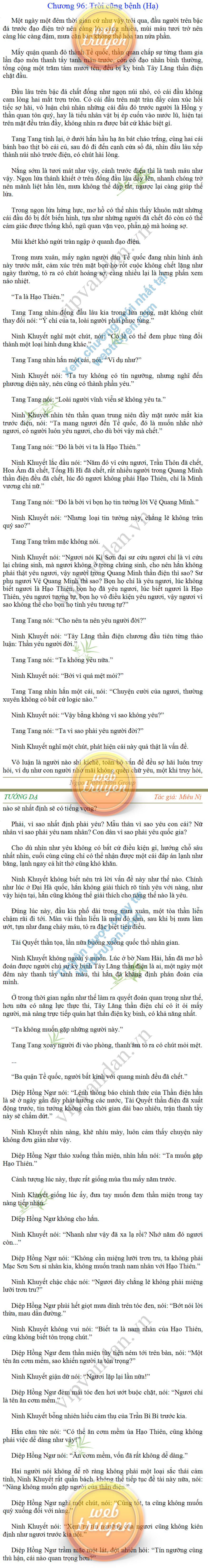 Tướng DạTruyện Converter, Truyện Huyền Huyễn, Truyện Kiếm Hiệp, Truyện Tiên HiệpTrên hoang nguyên trống trải bỗng xuất hiện ba người, cả ba đều không hẹn mà dừng chân dưới một thân cây còi cọc hiếm hoi, bọn họ không ai lên tiếng, chỉ im lặng cúi đầu nhìn xuống, tựa như dưới gốc cây có thứ gì đó rất thú vị, rất đáng để nghiên cứu và nghiền ngẫm. Hai đàn kiến vây kín quanh rễ cây màu nâu lộ ra trên mặt đất lạnh cóng tiến hành chiến tranh giành lãnh thổ, có lẽ vì trên mảnh hoang nguyên cằn cỗi vắng vẻ này chiếc rễ cây là một nơi trú ẩn tuyệt vời có một không hai nên trận chiến diễn ra hết sức khốc liệt, chỉ sau một lúc vài nghìn con kiến đã biến thành thi thể. Máu tanh là thế, nhưng thực tế trong mắt con người, vài nghìn xác kiến cũng chỉ là một mảng đen đen nhỏ xíu.Khí trời vẫn rất lạnh lẽo nhưng ba người đứng đó y phục lại khá mỏng manh, hình như họ không biết sợ lạnh là gì, cứ đứng bất động chăm chú quan sát. Không biết qua bao nhiêu lâu, bỗng một giọng khe khẽ cất lên:- Nước kiến nơi thế tục, đại đạo ra sao?Người vừa lên tiếng là một thiếu niên mặt mũi sáng sủa… *Chương này có nội dung ảnh, nếu bạn không thấy nội dung chương, vui lòng bật chế độ hiện hình ảnh của trình duyệt để đọc.