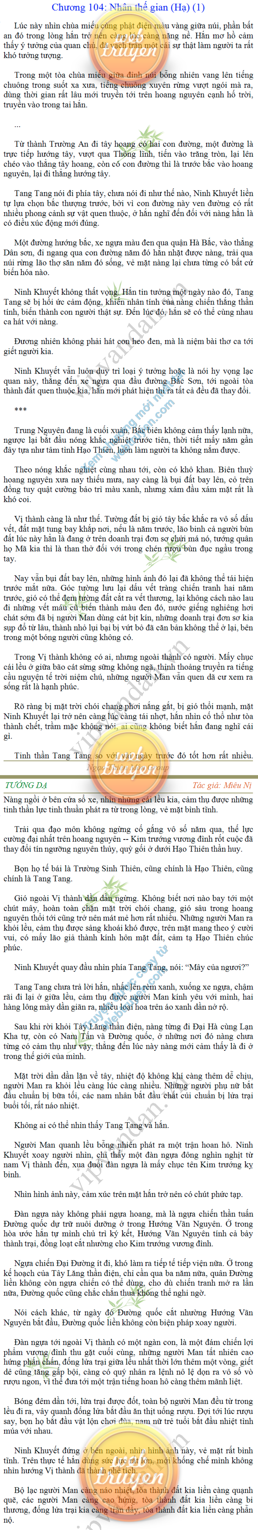 Tướng DạTruyện Converter, Truyện Huyền Huyễn, Truyện Kiếm Hiệp, Truyện Tiên HiệpTrên hoang nguyên trống trải bỗng xuất hiện ba người, cả ba đều không hẹn mà dừng chân dưới một thân cây còi cọc hiếm hoi, bọn họ không ai lên tiếng, chỉ im lặng cúi đầu nhìn xuống, tựa như dưới gốc cây có thứ gì đó rất thú vị, rất đáng để nghiên cứu và nghiền ngẫm. Hai đàn kiến vây kín quanh rễ cây màu nâu lộ ra trên mặt đất lạnh cóng tiến hành chiến tranh giành lãnh thổ, có lẽ vì trên mảnh hoang nguyên cằn cỗi vắng vẻ này chiếc rễ cây là một nơi trú ẩn tuyệt vời có một không hai nên trận chiến diễn ra hết sức khốc liệt, chỉ sau một lúc vài nghìn con kiến đã biến thành thi thể. Máu tanh là thế, nhưng thực tế trong mắt con người, vài nghìn xác kiến cũng chỉ là một mảng đen đen nhỏ xíu.Khí trời vẫn rất lạnh lẽo nhưng ba người đứng đó y phục lại khá mỏng manh, hình như họ không biết sợ lạnh là gì, cứ đứng bất động chăm chú quan sát. Không biết qua bao nhiêu lâu, bỗng một giọng khe khẽ cất lên:- Nước kiến nơi thế tục, đại đạo ra sao?Người vừa lên tiếng là một thiếu niên mặt mũi sáng sủa… *Chương này có nội dung ảnh, nếu bạn không thấy nội dung chương, vui lòng bật chế độ hiện hình ảnh của trình duyệt để đọc.