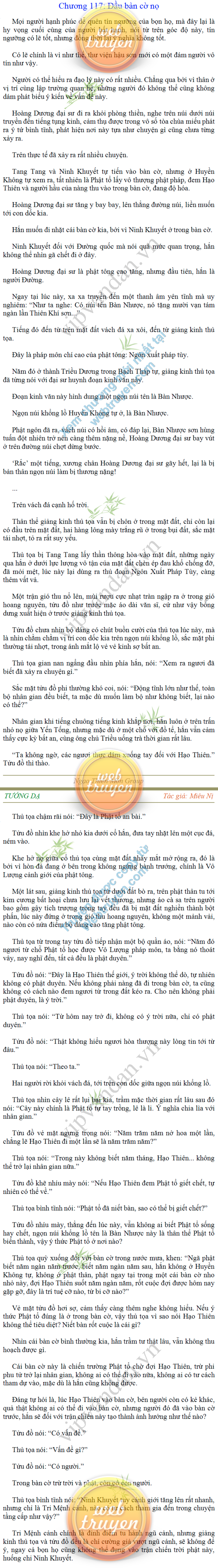 Tướng DạTruyện Converter, Truyện Huyền Huyễn, Truyện Kiếm Hiệp, Truyện Tiên HiệpTrên hoang nguyên trống trải bỗng xuất hiện ba người, cả ba đều không hẹn mà dừng chân dưới một thân cây còi cọc hiếm hoi, bọn họ không ai lên tiếng, chỉ im lặng cúi đầu nhìn xuống, tựa như dưới gốc cây có thứ gì đó rất thú vị, rất đáng để nghiên cứu và nghiền ngẫm. Hai đàn kiến vây kín quanh rễ cây màu nâu lộ ra trên mặt đất lạnh cóng tiến hành chiến tranh giành lãnh thổ, có lẽ vì trên mảnh hoang nguyên cằn cỗi vắng vẻ này chiếc rễ cây là một nơi trú ẩn tuyệt vời có một không hai nên trận chiến diễn ra hết sức khốc liệt, chỉ sau một lúc vài nghìn con kiến đã biến thành thi thể. Máu tanh là thế, nhưng thực tế trong mắt con người, vài nghìn xác kiến cũng chỉ là một mảng đen đen nhỏ xíu.Khí trời vẫn rất lạnh lẽo nhưng ba người đứng đó y phục lại khá mỏng manh, hình như họ không biết sợ lạnh là gì, cứ đứng bất động chăm chú quan sát. Không biết qua bao nhiêu lâu, bỗng một giọng khe khẽ cất lên:- Nước kiến nơi thế tục, đại đạo ra sao?Người vừa lên tiếng là một thiếu niên mặt mũi sáng sủa… *Chương này có nội dung ảnh, nếu bạn không thấy nội dung chương, vui lòng bật chế độ hiện hình ảnh của trình duyệt để đọc.