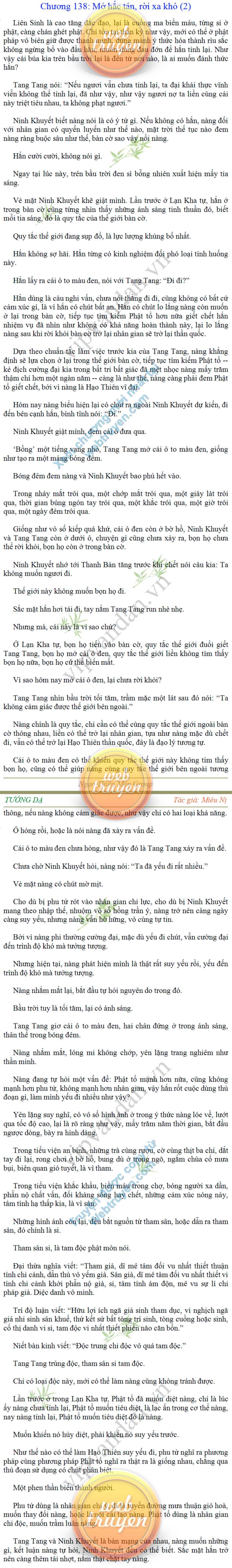Tướng DạTruyện Converter, Truyện Huyền Huyễn, Truyện Kiếm Hiệp, Truyện Tiên HiệpTrên hoang nguyên trống trải bỗng xuất hiện ba người, cả ba đều không hẹn mà dừng chân dưới một thân cây còi cọc hiếm hoi, bọn họ không ai lên tiếng, chỉ im lặng cúi đầu nhìn xuống, tựa như dưới gốc cây có thứ gì đó rất thú vị, rất đáng để nghiên cứu và nghiền ngẫm. Hai đàn kiến vây kín quanh rễ cây màu nâu lộ ra trên mặt đất lạnh cóng tiến hành chiến tranh giành lãnh thổ, có lẽ vì trên mảnh hoang nguyên cằn cỗi vắng vẻ này chiếc rễ cây là một nơi trú ẩn tuyệt vời có một không hai nên trận chiến diễn ra hết sức khốc liệt, chỉ sau một lúc vài nghìn con kiến đã biến thành thi thể. Máu tanh là thế, nhưng thực tế trong mắt con người, vài nghìn xác kiến cũng chỉ là một mảng đen đen nhỏ xíu.Khí trời vẫn rất lạnh lẽo nhưng ba người đứng đó y phục lại khá mỏng manh, hình như họ không biết sợ lạnh là gì, cứ đứng bất động chăm chú quan sát. Không biết qua bao nhiêu lâu, bỗng một giọng khe khẽ cất lên:- Nước kiến nơi thế tục, đại đạo ra sao?Người vừa lên tiếng là một thiếu niên mặt mũi sáng sủa… *Chương này có nội dung ảnh, nếu bạn không thấy nội dung chương, vui lòng bật chế độ hiện hình ảnh của trình duyệt để đọc.