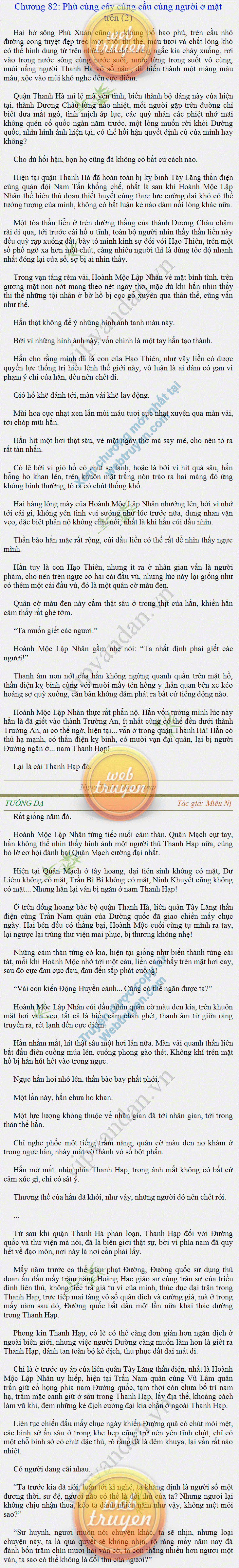 Tướng DạTruyện Converter, Truyện Huyền Huyễn, Truyện Kiếm Hiệp, Truyện Tiên HiệpTrên hoang nguyên trống trải bỗng xuất hiện ba người, cả ba đều không hẹn mà dừng chân dưới một thân cây còi cọc hiếm hoi, bọn họ không ai lên tiếng, chỉ im lặng cúi đầu nhìn xuống, tựa như dưới gốc cây có thứ gì đó rất thú vị, rất đáng để nghiên cứu và nghiền ngẫm. Hai đàn kiến vây kín quanh rễ cây màu nâu lộ ra trên mặt đất lạnh cóng tiến hành chiến tranh giành lãnh thổ, có lẽ vì trên mảnh hoang nguyên cằn cỗi vắng vẻ này chiếc rễ cây là một nơi trú ẩn tuyệt vời có một không hai nên trận chiến diễn ra hết sức khốc liệt, chỉ sau một lúc vài nghìn con kiến đã biến thành thi thể. Máu tanh là thế, nhưng thực tế trong mắt con người, vài nghìn xác kiến cũng chỉ là một mảng đen đen nhỏ xíu.Khí trời vẫn rất lạnh lẽo nhưng ba người đứng đó y phục lại khá mỏng manh, hình như họ không biết sợ lạnh là gì, cứ đứng bất động chăm chú quan sát. Không biết qua bao nhiêu lâu, bỗng một giọng khe khẽ cất lên:- Nước kiến nơi thế tục, đại đạo ra sao?Người vừa lên tiếng là một thiếu niên mặt mũi sáng sủa… *Chương này có nội dung ảnh, nếu bạn không thấy nội dung chương, vui lòng bật chế độ hiện hình ảnh của trình duyệt để đọc.