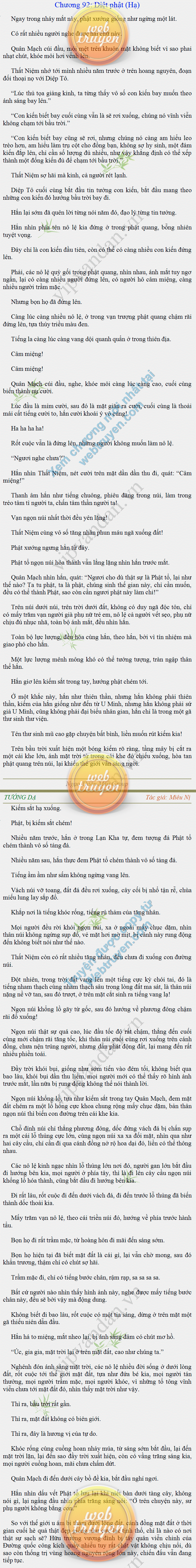 Tướng DạTruyện Converter, Truyện Huyền Huyễn, Truyện Kiếm Hiệp, Truyện Tiên HiệpTrên hoang nguyên trống trải bỗng xuất hiện ba người, cả ba đều không hẹn mà dừng chân dưới một thân cây còi cọc hiếm hoi, bọn họ không ai lên tiếng, chỉ im lặng cúi đầu nhìn xuống, tựa như dưới gốc cây có thứ gì đó rất thú vị, rất đáng để nghiên cứu và nghiền ngẫm. Hai đàn kiến vây kín quanh rễ cây màu nâu lộ ra trên mặt đất lạnh cóng tiến hành chiến tranh giành lãnh thổ, có lẽ vì trên mảnh hoang nguyên cằn cỗi vắng vẻ này chiếc rễ cây là một nơi trú ẩn tuyệt vời có một không hai nên trận chiến diễn ra hết sức khốc liệt, chỉ sau một lúc vài nghìn con kiến đã biến thành thi thể. Máu tanh là thế, nhưng thực tế trong mắt con người, vài nghìn xác kiến cũng chỉ là một mảng đen đen nhỏ xíu.Khí trời vẫn rất lạnh lẽo nhưng ba người đứng đó y phục lại khá mỏng manh, hình như họ không biết sợ lạnh là gì, cứ đứng bất động chăm chú quan sát. Không biết qua bao nhiêu lâu, bỗng một giọng khe khẽ cất lên:- Nước kiến nơi thế tục, đại đạo ra sao?Người vừa lên tiếng là một thiếu niên mặt mũi sáng sủa… *Chương này có nội dung ảnh, nếu bạn không thấy nội dung chương, vui lòng bật chế độ hiện hình ảnh của trình duyệt để đọc.